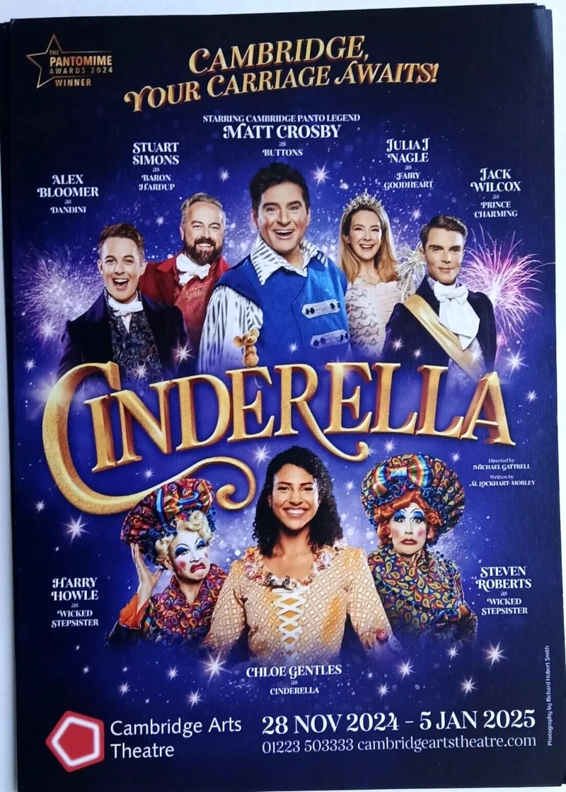 작년에 제가 케임브리지에서 본 공연을 예로 들어 보겠습니다. 2024년 12월 케임브리지의 판토는 신데렐라 이야기였습니다. 이 공연에서 신데렐라는 귀족의 딸이 아니라 케임브리지의 한 작은 컬리지 학장의 딸입니다. 왕자는 유럽 어느 나라에서 케임브리지 대학으로 유학 온 신입생입니다.