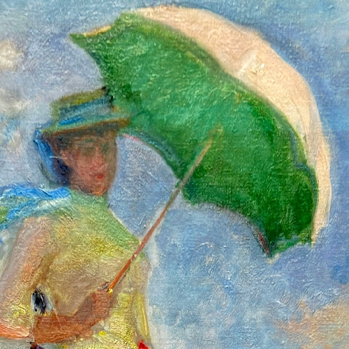 클로드 모네는 워낙 다작의 화신인지라 교과서에 실릴 만한 명작도 많이 남겼다. 그 중 하나가 <파라솔을 든 여인>인데, 모네가 양산(파라솔)을 쓴 자신의 아내 카미유와 아들 장을 그린 실외 인물화다. 모네가 첫 전시회에서 <인상, 해돋이>로 센세이션(물론 기존 미술계의 부정적인 반응이 컸으나)을 일으킨 1872년 이후에도 여전히 가난한 화가로 실외에서 빛과 그림자를 쫓던 1875년에 그린 작품이었다.