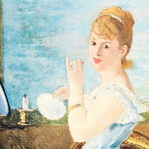 제목은 <나나>. 화려한 옷을 입고 짙은 화장을 한 여성이 작품의 중앙에 서 있다. 말쑥하게 차려입은 노신사가 의자에 앉아있다. 캔버스에 살짝 드러나는 가구는 침대로 보인다. 이번에도 마네는 매춘 현장을 날 것 그대로 화폭에 옮겼다. '나나'는 당시 상류층을 주로 상대하는 이른바 고급 매춘부가 즐겨 사용하는 예명이었다고 한다. 거울을 보며 화장을 고치는 나나는 촛불을 끄고 '일할 준비'를 마친 것 같고, 노신사는 침대를 바라본다.