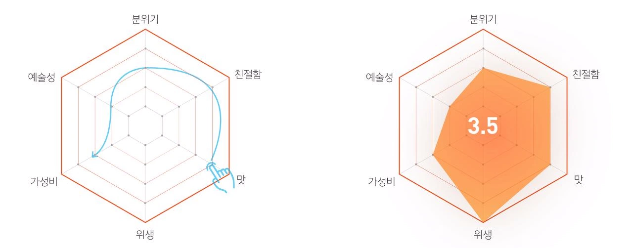 육각 혹은 오각형의 다이어그램을 드래그하면 오른쪽과 같은 도형이 그려지면서 종합 평가가 가능하다. (위의 평가 기준은 임의대로 작성한 것이고, 인터페이스 또한 개념도에 불과함) 점수 평가와는 별도로 만족도 픽토그램을 넣어 만족도 또한 측정하면 좋겠지만, 대체로 종합점수가 높다면 만족도도 높을 가능성이 크기 때문에 빼는 것이 좋다는 판단이 든다. 최종적으로 사용자는 식당의 평가 점수를 숫자로 알 수 있고, 상세정보로 들어갔을 때는 사용자들의 평가가 면적으로 나타난다. 어쩌면 식당과 식당을 면적으로 비교하면 식당의 특징도 알 수 있을 듯하다. 뭐 먹을까로 시작한 단상은 어쩌다 여기까지!