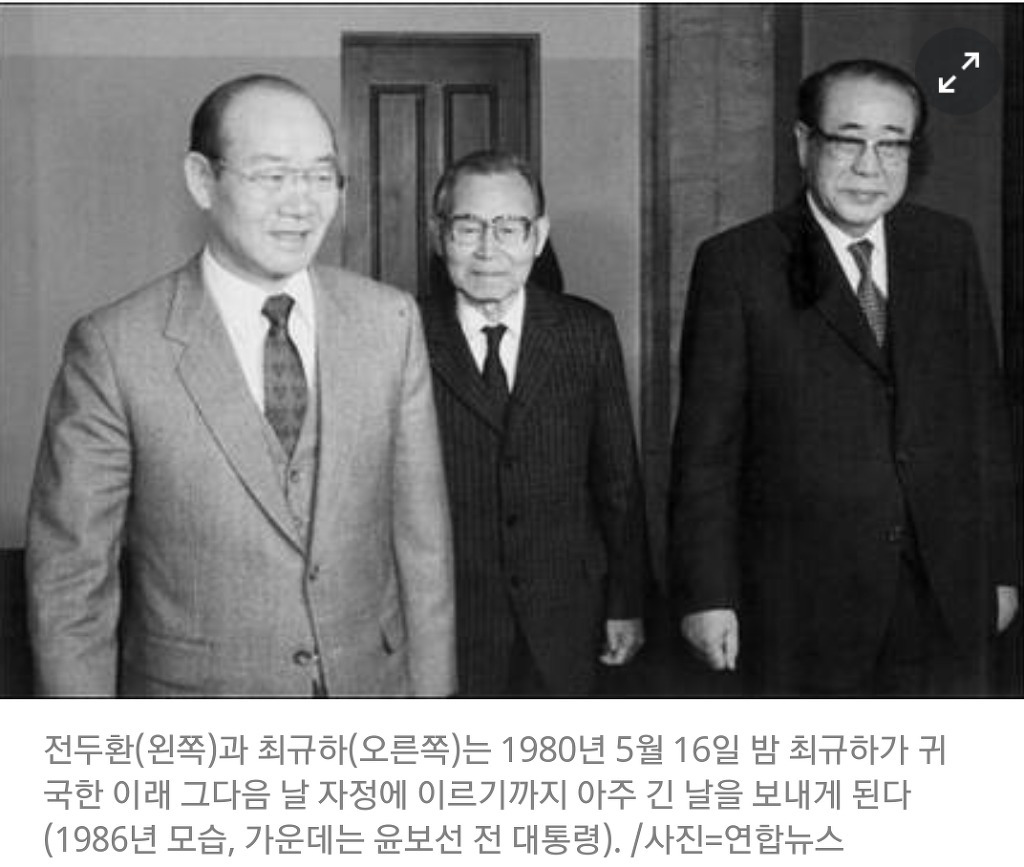 제10대 대통령에 당선된 최규하는 처음에 유신체제를 청산하고 새로운 헌법을 제정하여 민주적 정부를 수립할 계획을 갖고 있었지만, 취임 며칠 만에 박정희가 군부 내에 육성한 전두환, 노태우 등 '하나회'의 신군부 쿠데타가 발발하여 권력을 장악함으로써 민주주의로의 평화적 이행은 물거품이 되고 맙니다.