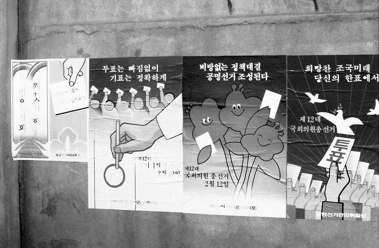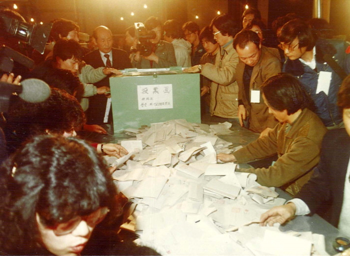 전두환 정권에 대한 국민적 저항은 1983년 5월 김영삼이 광주 민주화 항쟁을 기념하며 시작한 단식 투쟁과 6월 <민주화 추진 범국민단체> 구성으로 가열되기 시작해서 1984년 5월 <민주화 추진협의회> 결성으로 결실을 맺습니다. 1985년 2월 12일 실시하는 제12대 국회의원 선거를 앞두고 야권과 학생운동권은 선거참여 문제를 두고 이견이 분분했습니다. 김영삼 지지자들을 중심으로 선거참여를 강력히 주장한 반면 김대중 지지자와 재야 민주화 진영은 야당인 민주한국당이 제 기능을 다하지 못하는 상황에서 선거참여는 전두환 정권의 정통성을 강화시켜주는 명분만 제공할 뿐이라며 선거 참여를 거부하려 했습니다.