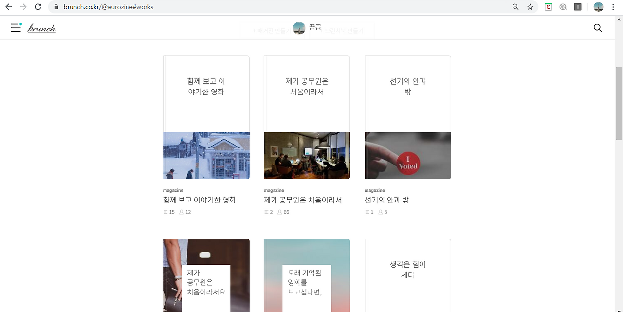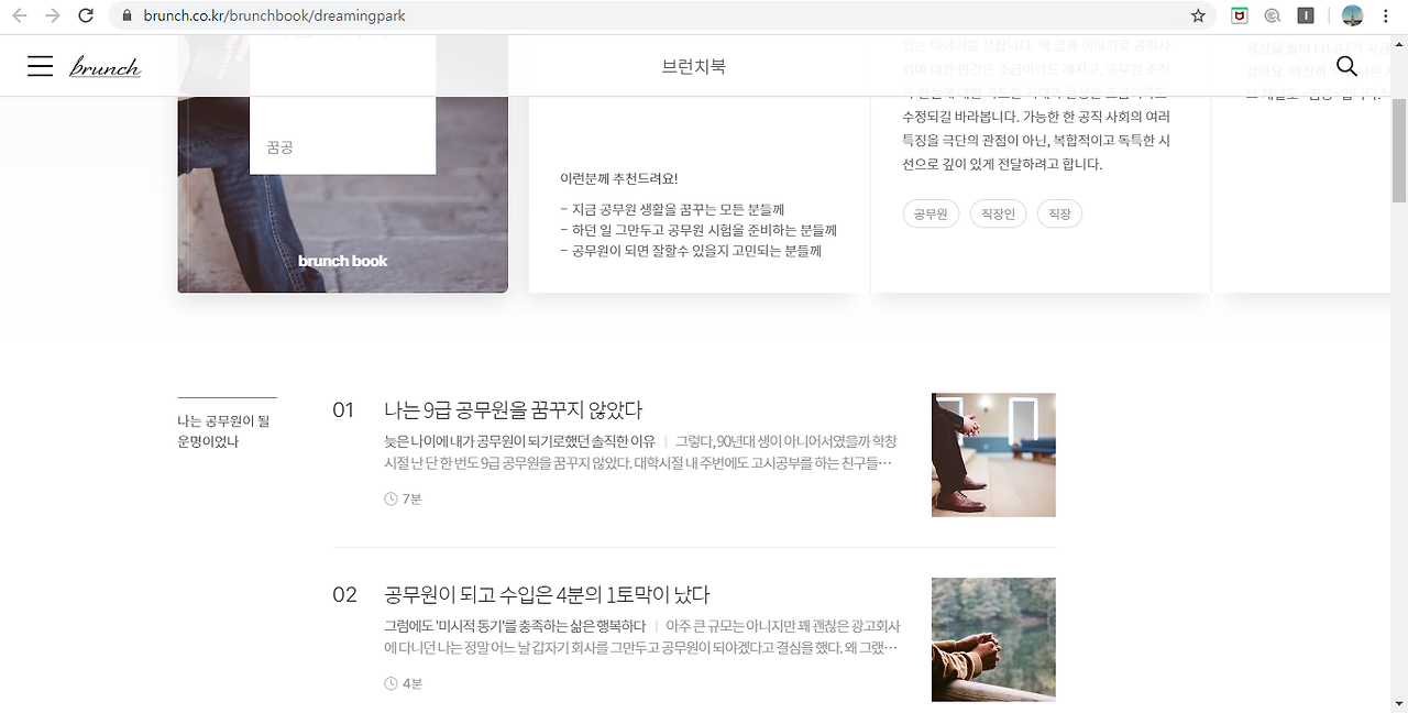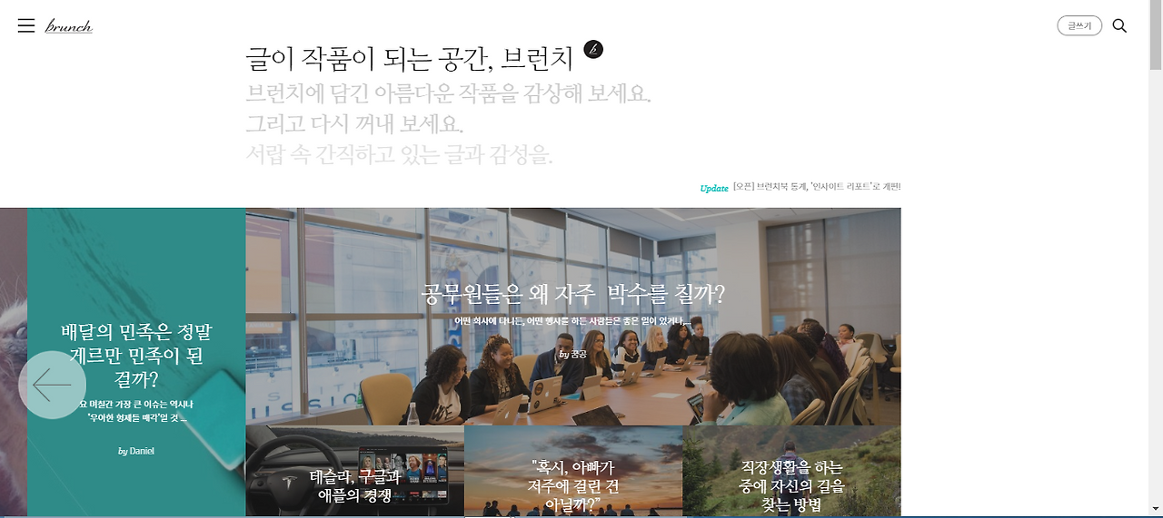 2019년 2월 처음, 다음이 운영하는 글쓰기 플랫폼 <브런치>를 알게 되어 그 미려한 디자인과 편리한 인터페이스에 반해 지난 1년 동안 브런치에 글을 쓰기 시작했다. 글쓰기가 본업이 아니고 '공무원'이란 생업이 있는 터에 자유롭게 글쓰기도 다소 어려웠고, 글을 쓸 시간을 확보하기도 매우 어려웠다. 퇴근 후에 사무실에 남아서 글을 쓰거나, 주말에 일부러 시간을 내서 컴퓨터 앞에 앉아야 했는데 쉬운 일은 아니었다. 그럼에도 마음 한구석에 차오르는 갈증 같은 글쓰기 욕구는 나로 하여금 지난 1년간 꾸준히 브런치에 글을 쓰게 만들었다.