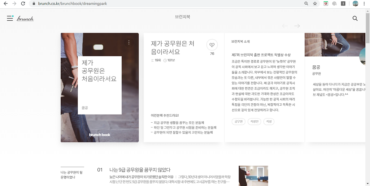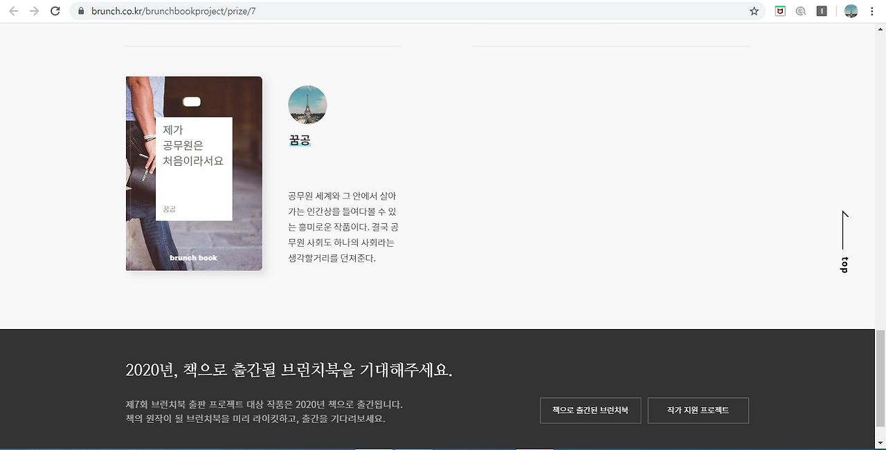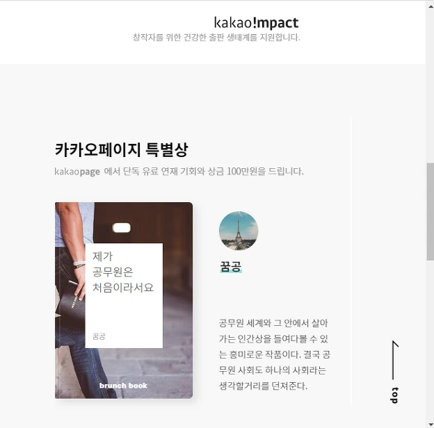 사실, 1주일 전에 카카오페이지 담당자로부터 이메일을 받았다. 내가 응모한 브런치북 꿈공의 '제가 공무원은 처음이라서요'가 <제7회 브런치북 출판 프로젝트 특별상> 후보로 선정되었고 계약 의사가 있는지 물어보는 담당자의 메일이었다. 상금 100만 원과 유료 연재의 기회도 준다니!. 계약 의사고 뭐고 행여라도 수상자 선정에 번복이 있을까 봐(?) 바로 답 메일을 썼다. 너무 고맙고 감사드린다고.