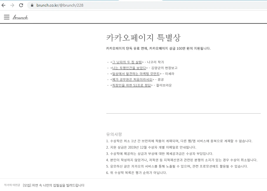 물론, 오프라인 출판기회와 500만원의 상금이 주어지는 대상(호~~?)은 아니다. 대상이 아니어서 아쉽지 않냐고? 아니다. 정말 그런 생각은 조금도 안 해봤고, 그저 특별상에 너무나 기쁘고 감지덕지할 뿐이다. 브런치에는 내 글말고도 너무 좋고 의미있는 글들과 재능과 능력이 뛰어난 작가분들이 넘쳐난다. 글이 주업이 아닌 나와는 달리 글을 주업으로 삼는 분들도 많고 다양한 분야에서 깊은 성찰과 독특한 시선으로 주변을 풀어내는 '작가'분들이 너무 많다. 그러므로 대상은 과한 욕심임을 잘 안다.