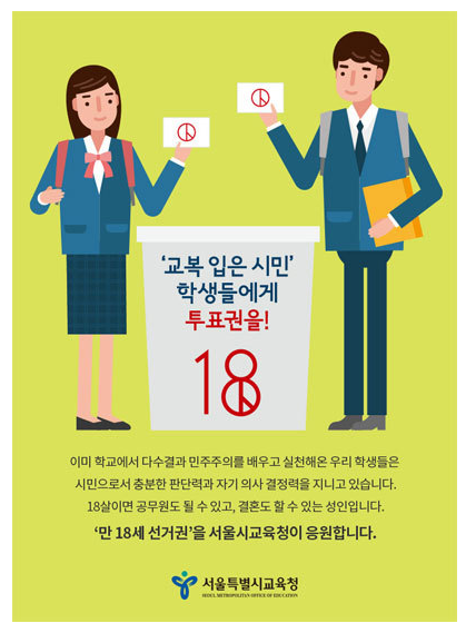 선거연령 18세 인하에 반대하는 주장의 근저에는 고3으로 대표되는 18세 학생들의 인격적 성숙을 인정하지 않는 불신이 자리합니다. 고등학교 학생들은 아직 인격적으로 미성숙하고, 스스로 사고하고 스스로 결정하는 독립적인 주체로 인정되지 않는 것이지요. 그러하기에 진보 교육감과 전교조 교원들이 도사리고(?)는 있는 학교에서 고3 학생들에게 선거권이 부여되면 교사들의 일방적인 주장이 학생들에게 주입되어 자신들의 정치적 목적을 위해 학생들이 동원되고 희생될 것이라는 우려를 표명하는 것입니다.