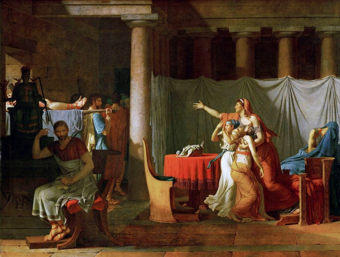 이 그림이 1785년 파리 살롱전에 출품되었을 때 사람들은 열광했습니다. 이 그림은 원래 루이 16세의 명령에 의해 그려진 것이었고 국가를 위해 개인을 희생한다는 주제나 고대 그리스 로마 신화의 이상적 아름다움을 완벽하게 형상화한 작품의 완성도 모두 국왕을 만족시키기에 충분한 것이었습니다. 아들에게 전장에 나가 싸울 칼을 내려주며 축복을 하는 아버지를 중심으로 그림의 왼쪽과 오른쪽은 완벽한 대칭을 이룹니다.