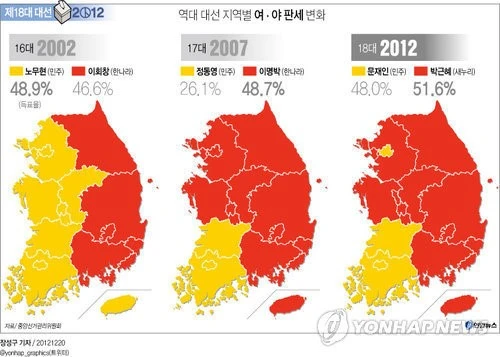 4월에 치러진 총선을 승리로 이끈 새누리당의 박근혜 후보가 뜻밖의 선전으로 대한민국의 제18대 대통령에 선출되었습니다. 사실, 개표 결과가 최종 집계될 때까지 아무도 그의 승리를 장담할 수 없었는데. 선거 초반만 해도 이명박 정부에 대한 국민적 반감이 워낙 강해 이번 대선에서는 야당 후보가 무난히 승리할 것으로 예측되었습니다. 게다가 야권 후보자 중에 이른바 '안철수 바람'을 일으켰던 안철수 후보자가 여러 우여곡절 끝에 야권 후보 단일화 협상이 실패하자 정권교체를 위해 11월 23일 자신 사태하여 선거구도는 여야 간의 양강 구도로 정리되면서 후보 단일화의 혜택을 볼 수 있는 야당 후보에게 상대적으로 유리할 것으로 점쳐졌으나 선거 결과는 예상과 달랐습니다.