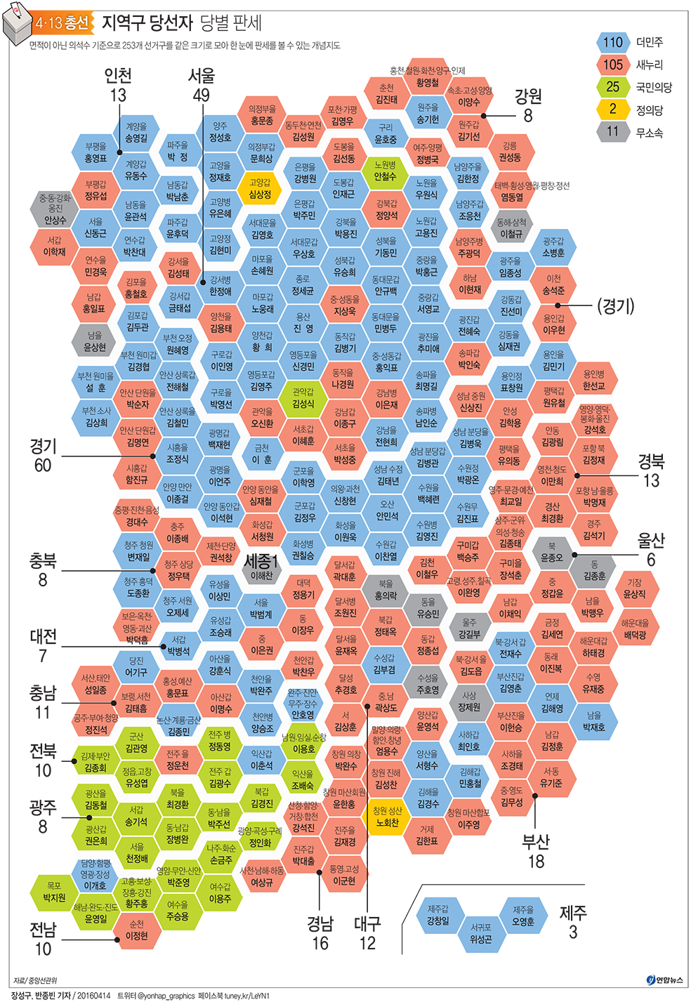 그만큼 제20대 총선의 결과는 놀라운 것이었습니다. 선거 직전만 해도 집권여당의 압승을 예측하는 언론사들이 많았고 심지어 집권 여당이 개헌선에 해당하는 200석 이상을 무난히 확보해 개헌을 추진할 가능성까지 점쳐지고 있었습니다.