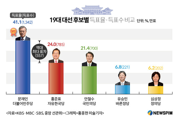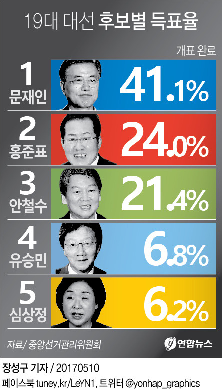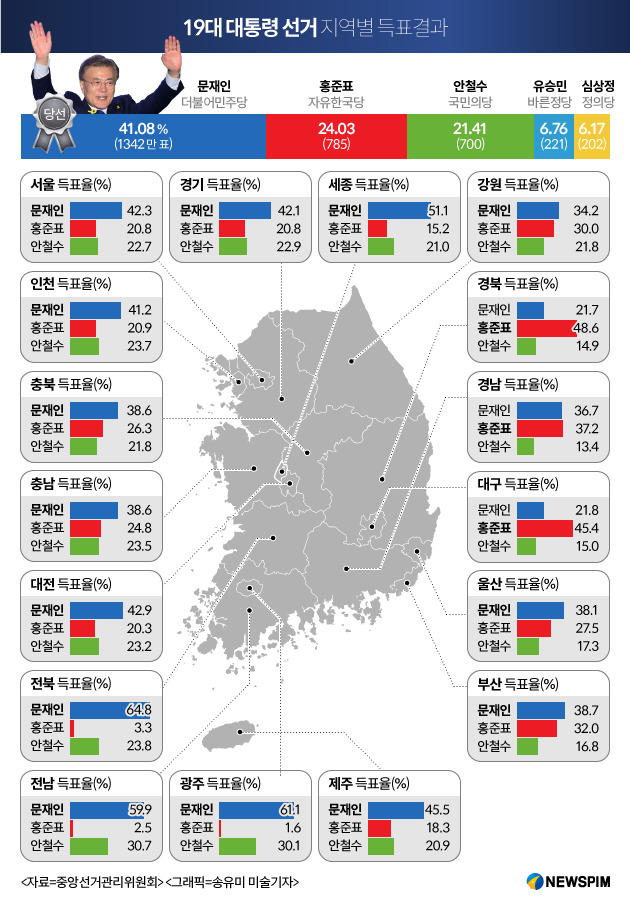2017년 5월 9일 실시된 제19대 대통령선거 결과는 예상을 크게 빗나가지 않았습니다. 사상 초유의 대통령 탄핵심판과 최순실 게이트의 여파로 집권 세력과 여당인 새누리당에 대한 국민적 분노와 실망이 극에 달한 상태였고 따라서 야당인 더불어민주당 문재인 후보의 압승이 일찌감치 예견되었습니다. 일부 야당 지지자들은 이런 예단과 낙관 속에서 '어대문'(어차피 대통령은 문재인)이라는 표현까지 사용하기도 했습니다. 한 때 새누리당의 당명을 자유한국당으로 바꾸며 일부 지지 세력을 결집시키는 데 성공한 홍준표 후보와 민주당 경선 직후 이탈한 반문재인 세력의 지지를 흡수하며 지지율 1위 후보에까지 오른 국민의 당 안철수 후보의 맹추격으로 문재인 후보의 입지가 다소 흔들리는 듯했지만 선거 결과 이변은 없었습니다.