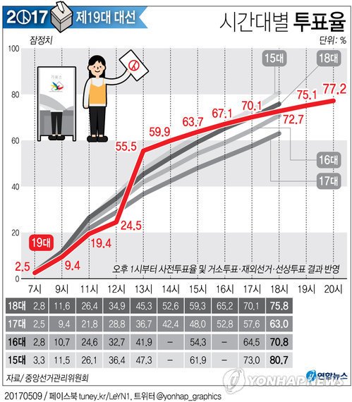 선거 결과 1위 더불어민주당 문재인 후보의 득표율이 41.07%, 2위 자유한국당 홍준표 후보 24.05%, 3위 국민의당 안철수 후보 21.42%로 문재인 후보가 2위 홍준표 후보를 득표율 17.1% 차이로 , 표차 5,570,951표로 따돌리고 제19대 대통령에 당선됩니다. 이번 선거에서 1위와 2위의 표 차이 550만여 표는 우리나라 선거 역사상 역대 최다 표 차이로 기록됩니다. 투표율은 박근혜-최순실 게이트와 국정농단 사태, 탄핵심판을 이끌어 낸 촛불시위 등으로 고양된 정치적 열기를 반영하여 젊은 층의 투표율이 높을 것으로 예상되었습니다. 실제로도 최종 투표율은 77.2%로 아쉽게 80%는 넘지 못했지만 87년 민주화 이후 네 번째로 높은 투표율을 기록했습니다. 이는 지난 18대 대선의 75.8%보다 1.4% 더 높은 것이었습니다. 대통령선거에서는 처음 적용된 사전투표의 투표율이 애초 26.6%로 사상 최대로 높게 나오자 최종 투표율도 처음에는 80%를 쉽게 넘길 것으로 예상하는 사람들이 많았습니다. 하지만 선거일이 5월 9일로 정해지면서 사전투표일에 미리 투표를 하고 본 투표일에는 여행을 떠나는 등 사전투표가 유권자의 투표일을 분산시키는 효과가 더 크게 나타나면서 최종 투표율은 80%를 넘기지 못했지만 그래도 87년 민주화 이후 20여만에 최고 투표율을 기록했음은 주목할 만한 사실입니다.