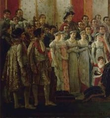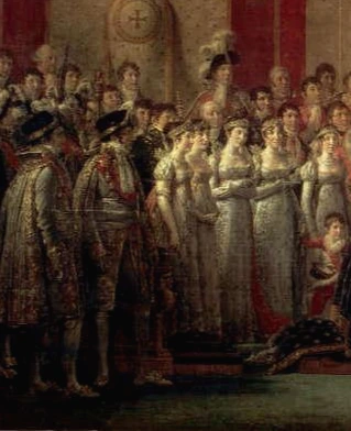 그림 속에 등장하는 주요 인물로는 나폴레옹의 형제들로 나중에 나폴리 왕의 자리에 오르는 형 조제프와 네덜란드의 왕이 되는 루이가 가장 왼쪽에 등장합니다. 그 옆에 나란히 서 있는 다섯 명의 여자들은 왼쪽부터 나폴레옹의 누이 캐롤린, 폴린, 엘리자와 동생 루이의 아내 오르탕스, 형 조제프의 아내 줄리입니다. 줄리의 손을 잡고 있는 사내아이는 조세핀의 아들 샤를입니다.