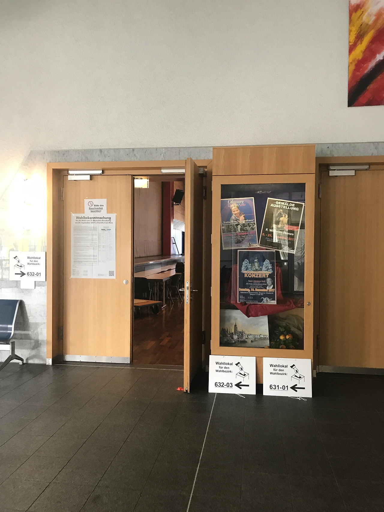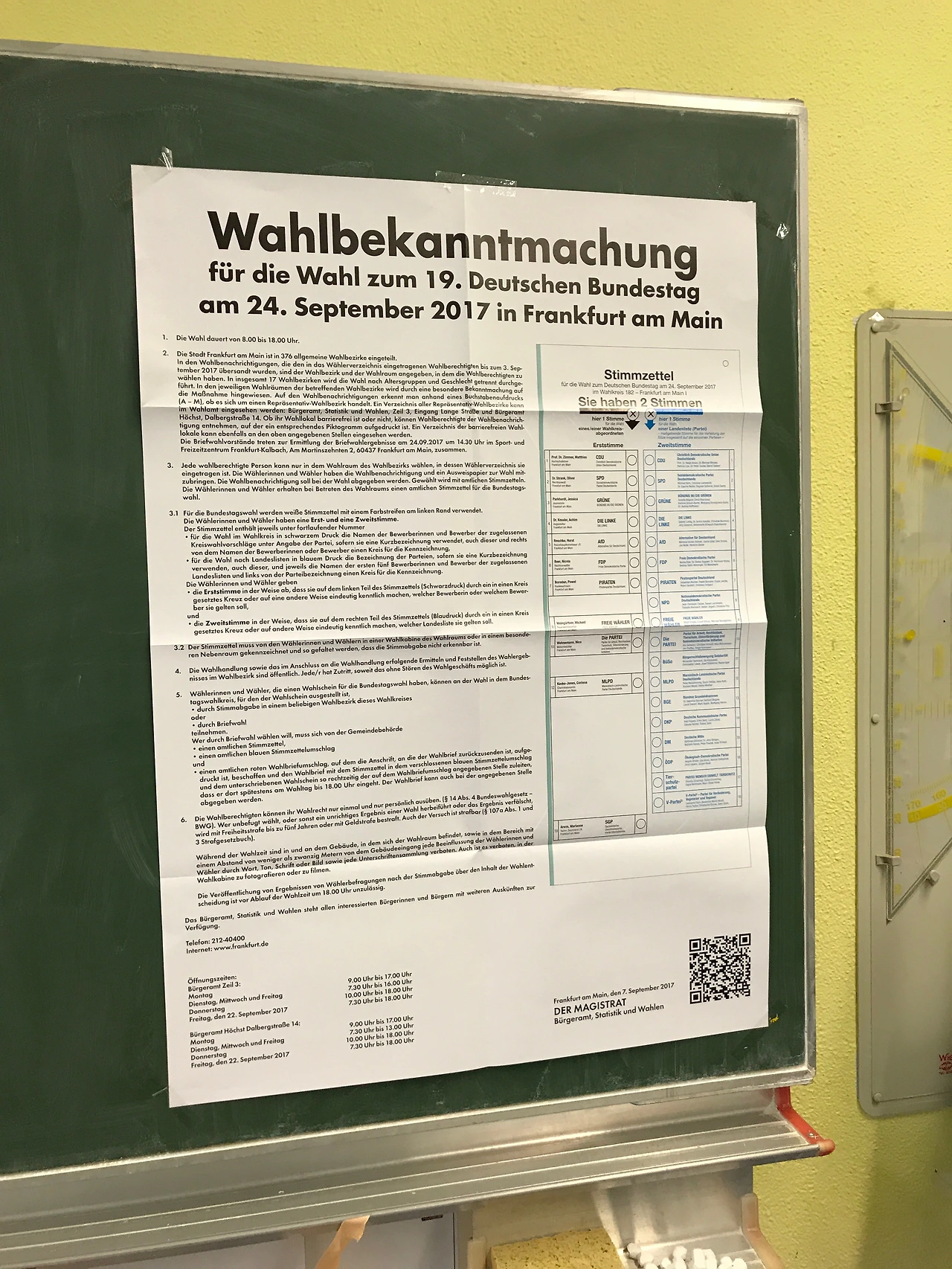 제가 오늘 제일 먼저 찾은 곳은 프랑크푸르트 Frankfurt am Main 시에 소재한 한 고등학교 Bettinaschule에 설치된 투표소입니다. 우리나라 선거는 보통 오전 6시에 시작해서 오후 6시면 종료되지만 독일의 투표시간은 오전 8시부터 오후 6시까지입니다. 오전 7시 30분경 투표관리관과 투표사무원들이 투표소 설비를 하고 있습니다. 투표소 입구에는 투표소 번호(100-02, 180-02 등)가 적힌 투표소 표지판이 걸려있고 투표소 안에는 기표대 4개와 투표함 하나가 준비되어 있습니다. 선거철이면 거리 곳곳에서 흔히 볼 수 있는 제19대 연방의회 선거 공고문도 하나 투표소 안에 걸려 있습니다.