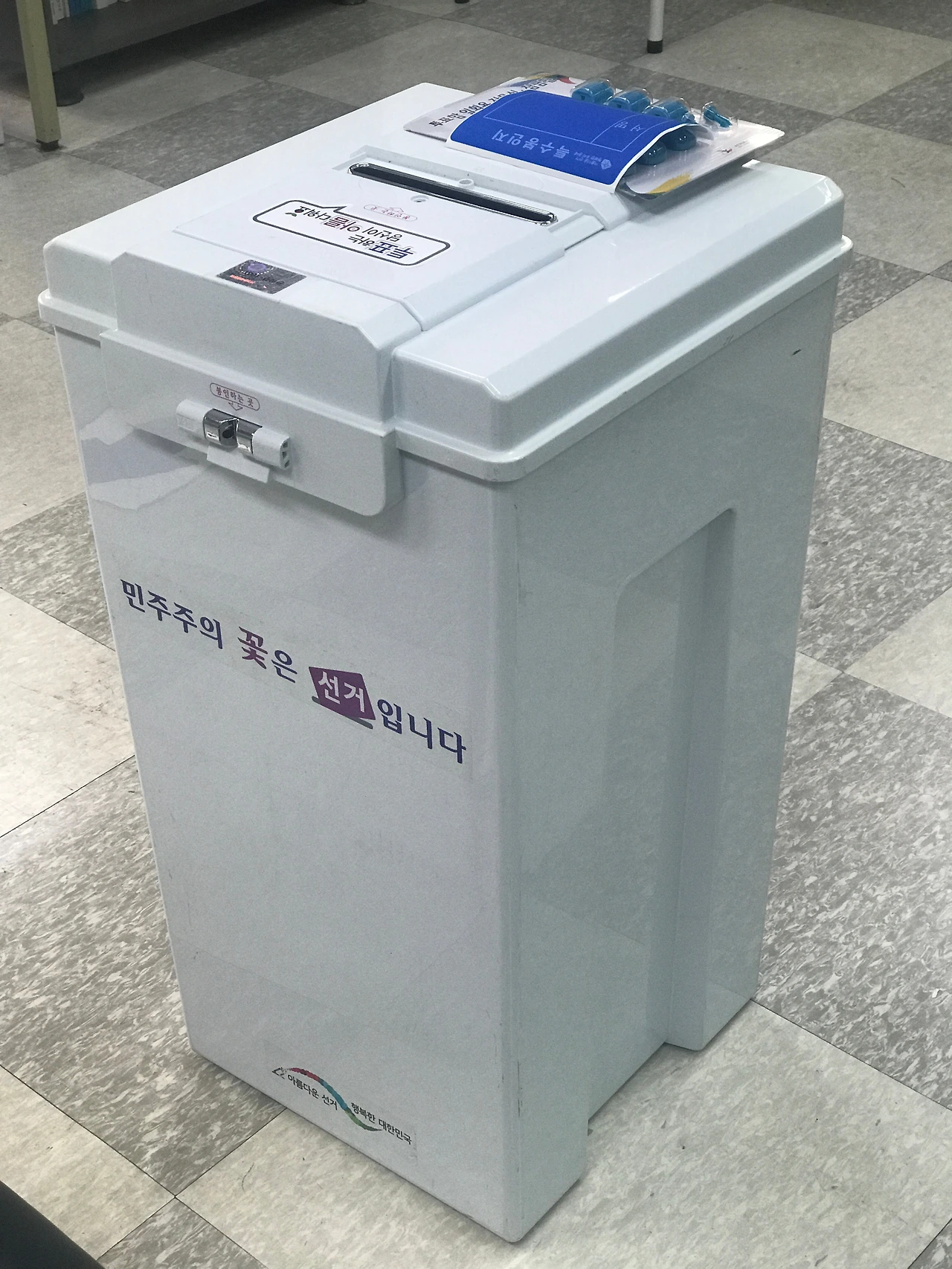투표가 시작되기 전에 투표관리관은 투표함을 확인한 후에 봉인하고 기표대의 이상 유무를 살핍니다. 우리나라에서 투표함을 봉인할 때 사용하는 특수 봉인지나 특수 자물쇠는 찾아볼 수 없습니다. 그냥 하얀 종이테이프를 투표함 뚜껑 주위에 붙이는 게 전부입니다. 누구나 붙였다 떼었다 할 수 있는 테이프를 말입니다. 우리가 사용하는 특수 봉인지는 한번 붙였다 떼면 표시가 드러나기 때문에 재사용할 수 없는 안전한 특수 봉인지입니다. 그리고 자물쇠는 뻰치로 잘라내야만 떼어낼 수 있을 정도로 튼튼하고 강력합니다.