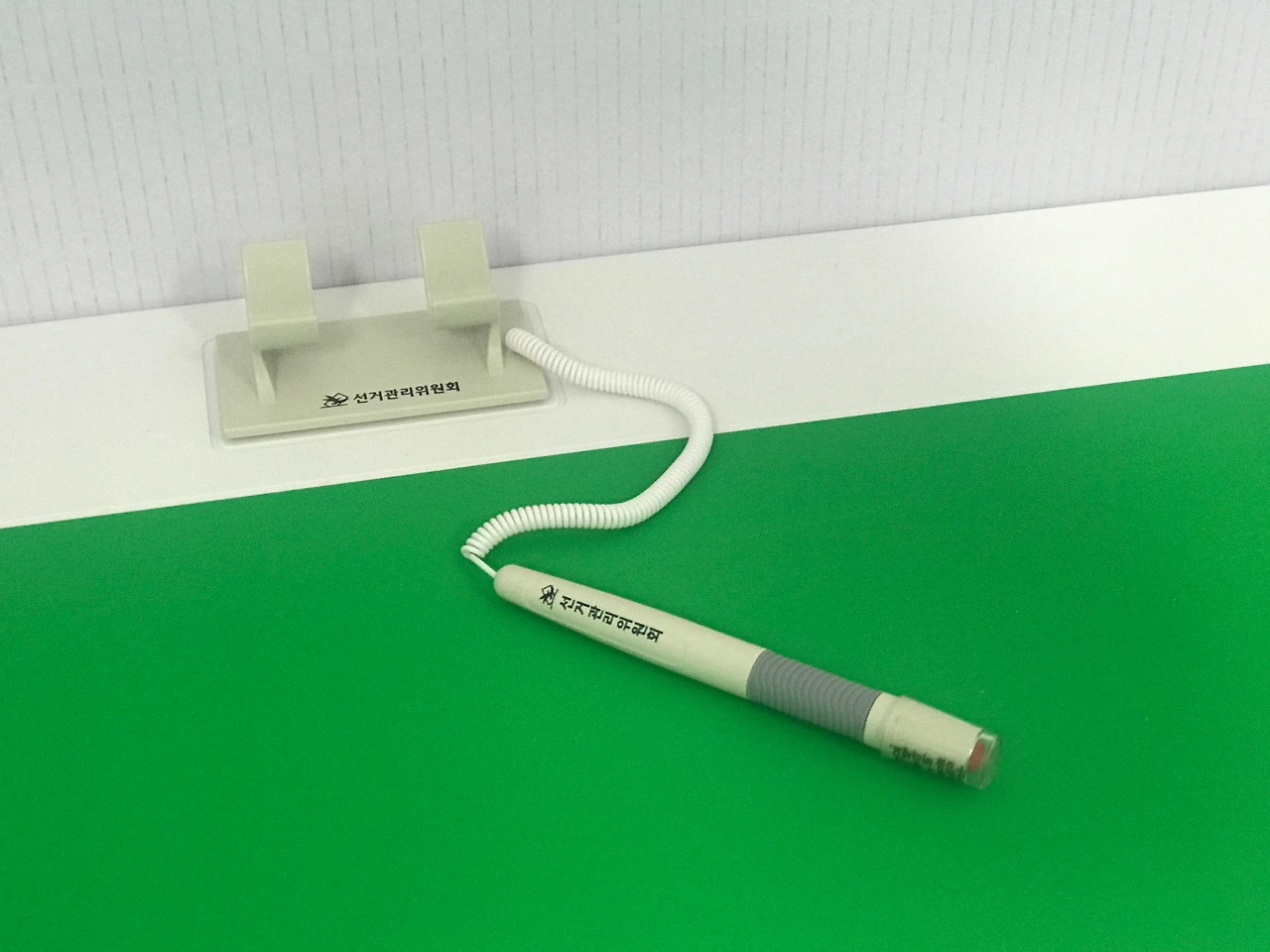 그럼 독일의 투표는 우리와 무엇이, 어떻게 다를까요? 우선, 투표소 설비들이 허술하고 미흡하기 짝이 없습니다. 먼저 기표대를 보면 조립식 판때기 3개를 경첩으로 이어 붙인 패널을 책상 위에 올려놓은 것이 전부입니다. 약간만 힘을 줘도 쓰러지거나 넘어지겠죠. 그리고 그 기표대에는 연필 한 자루가 끈으로 묶여있습니다. 연필이라니 기가 막힙니다. 연필로 소중한 투표용지에 기표를 하다니! 우리 투표소에서 볼 수 있는 3면이 철저히 막혀있고 가림막까지 쳐져 있어, 투표하는 선거인 외에는 그 누구에게도 기표하는 모습이 노출될 수 없는 완벽한 기표대는 찾아볼 수가 없습니다. 이런 허술한 기표대에서 투표를 한다면 어떻게 투표의 비밀이 보장될 수 있을지, 부정선거의 가능성이 얼마나 높을지 걱정스럽습니다. 번질 염려 없는 특수 인주를 묻힌 특수 기표용구가 아니라 연필로 기표를 하다니 도대체 어쩌자는 것일까요? 연필로 기표를 해서 지워지기라도 한다면, 아니 누군가가 지우개로 내가 기표한 투표용지를 지우기라도 한다면 어떻게 하려고 독일 선거에서 유권자들은 연필로 기표를 하는 것일까요? 독일이 정치 선진국, 민주주의의 모범 국가는 맞는 것일까요?