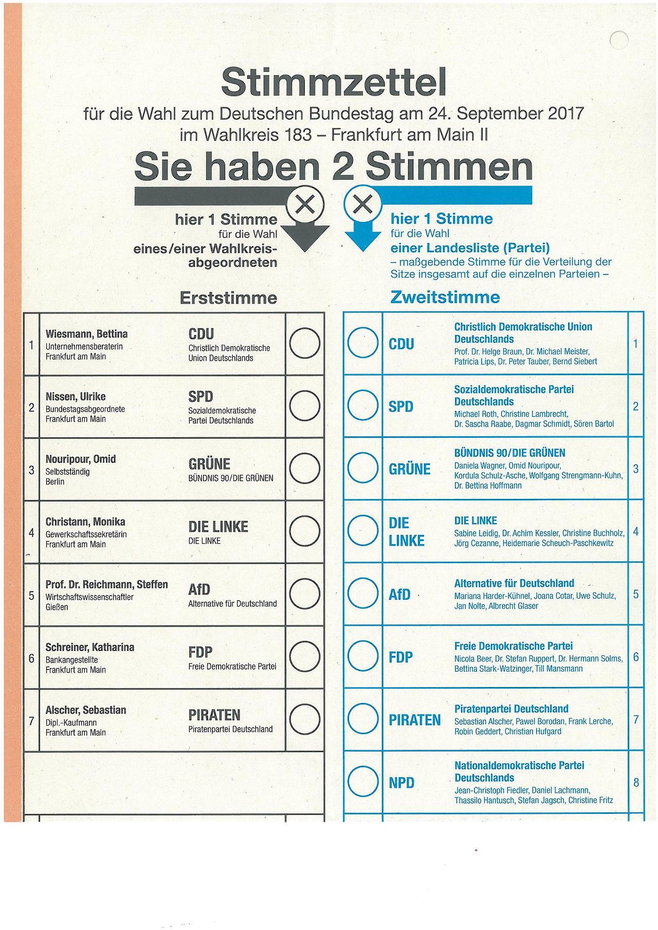 독일의 투표용지를 보면 한 사람이 두 표를 행사합니다. 이를 제1투표(erstestimme)와 제2투표(zweitestimme)라 합니다. 제1투표는 선거구의 후보자에게 투표하는 것이고, 제2투표는 각 정당에 투표하는 것입니다. 투표용지도 각 정당 순서대로 배열되어 있습니다. 왼쪽에 A정당의 지역구 후보자, 오른쪽에 A정당의 비례대표 명부를 게재하는 식입니다. 어느 정당이 지역구 후보자를 배출하지 않았으면 그 란은 공란으로 남게 됩니다. 유권자들은 자신의 지역구 후보자는 맘에 들지만 그가 속한 정당이 맘에 들지 않으면 이른바 교차투표를 할 수도 있습니다. 후보자에 대한 투표와 정당에 대한 투표가 다르게 말입니다. 이런 독일의 정당명부식 연동형 비례대표제는 참으로 독일스럽고 합리적이며 흥미로운 선거제도입니다. 국민들의 정치적 의사가 정확하게 의회의 의석비율로 반영되고 사표의 가능성도 줄일 수 있으며, 정당정치의 활성화와 정책중심 선거의 강화로 이끌어질 수 있는 오묘한 선거제도입니다.
