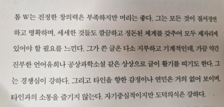 그런데 여기에서 책은 하나의 Clue 를 더 제시하는데 그것은 아래와 같은데, 이 내용은 톰W 가 고등학교때 심리테스트를 기초로 톰의 성격을 간략히 기술한 부분이라고 한다.