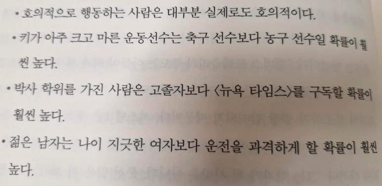 아래는 대표성의 과오로 대표되는 몇가지 예시이다. 우리는 얼마나 집단의 유사성에 근거하여 상대에 대해서 전형적 이미지로 판단하고 있지는 않은가?
