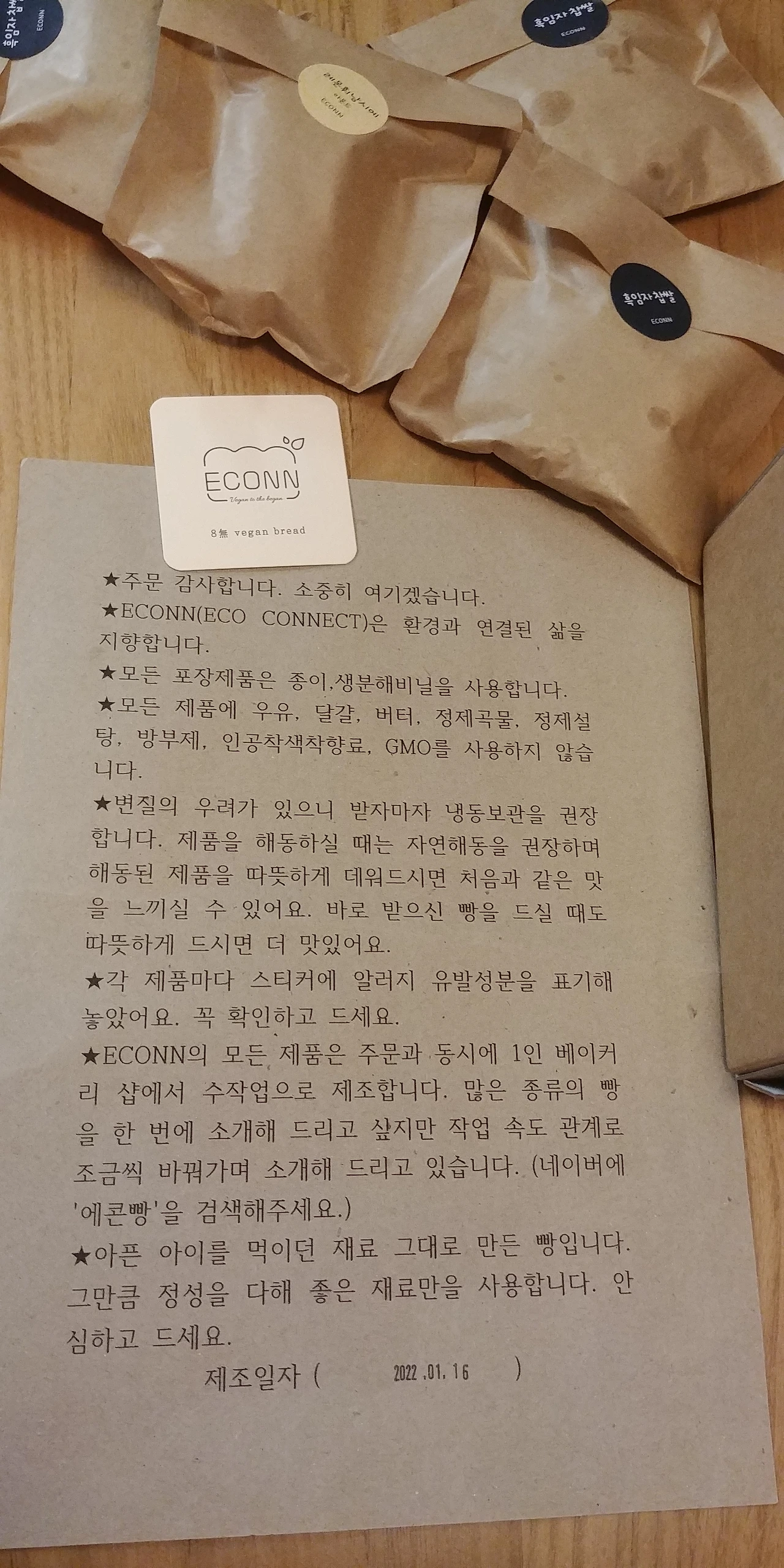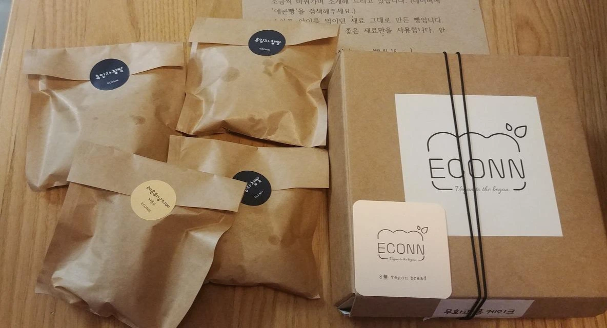 그러던 중 브런치를 통해 만난 에콘의 빵이었다. 이상한 건 수많은 비건 케이크들을 마주했을 때 갖지 못한 생각들이 에콘의 케이크 앞에서 떠오르는 거였다. 향수를 불러오는 느낌의 맛이랄까? 그렇지 않고서야 수십 년 전 할아버지의 파운드케이크를 훔쳐먹던 얘기를 끄집어내 글로 쓸 수 있었을까 싶다. 검색창에 '에콘 빵'을 치고 들어가면 이런 설명을 볼 수 있는 것도 흥미로웠다. 'ECONN(eco connect)의 vegan빵으로 환경과 연결된 삶을 실천할 수 있어요.'라는. 애당초 편리와 기능의 측면에서 열어놓은 '브런치 글쓰기 플랫폼'이었는데 그 이상의 느낌으로 다가오는 게 꽤 특별한 경험이란 생각이 든다.