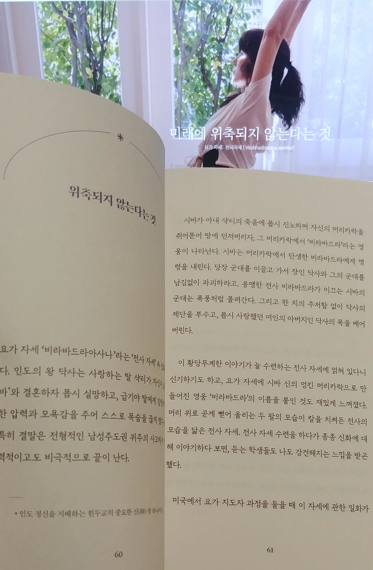 이 황당무계한 이야기가 늘 수련하는 전사 자세에 얽혀 있었다니, 신기하기도 하고, 시바 신의 엉킨 머리카락으로 만들어진 영웅 ‘비라바드라’의 이름을 붙인 게 재밌게 느껴졌다. 머리 위로 곧게 뻗어 올리는 두 팔의 모습이 칼을 치켜든 전사의 모습을 닮은 전사 자세. 전사 자세 수련을 하다가 종종 신화에 대해 이야기하다 보면, 듣는 학생들도 나도 강건해지는 느낌을 받곤 했다.