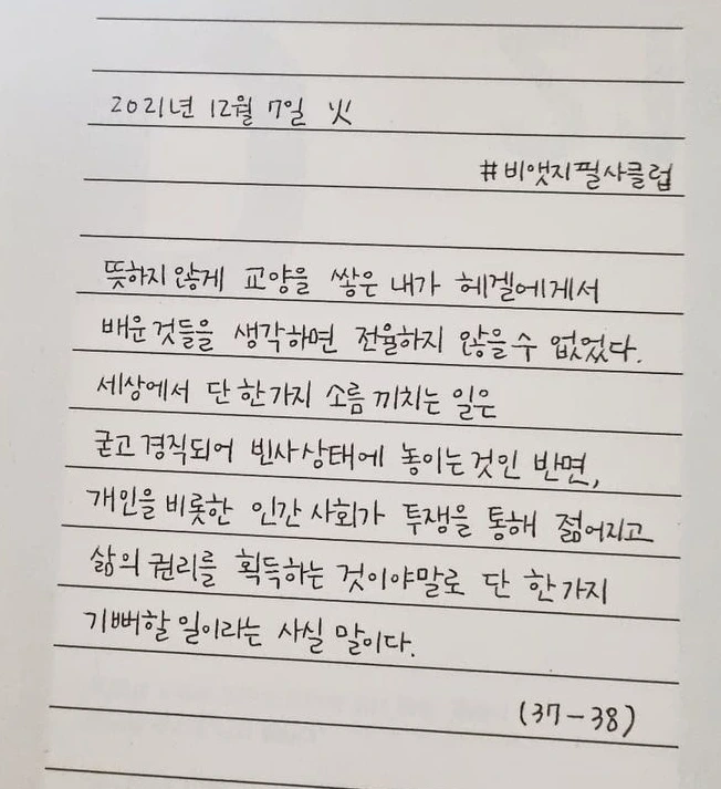 이 독자분의 일상 속 피드에 올린 필사한 글씨체가 참 단단하고도 정결한 느낌이다. 필사한 노트 속 헤겔의 문장이 눈길이 간다.