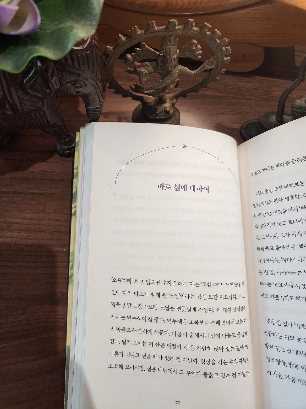 때로 ‘풍경’ 또한 바라보는 이의 감정 상태에 따라 풍경 이상의 것을 불러오기도 한다. 엉뚱한 꼬리 물기 끝에 다다른 곳은 ‘바로 서다’라는 문장 앞. 이것을 다시 ‘바로 섬'이라 줄여 놓고 보니 프랑스의 철학자이자 작가 장 그르니(Jean Grenier),에의 수필집 ‘섬’ 앞에까지 도달하게 된다. 그제서야 요가자세 타다아사나(Tadasana) 앞에 선다. ‘산 자세’를 위해 돌고 돌아서 온 셈이다.
