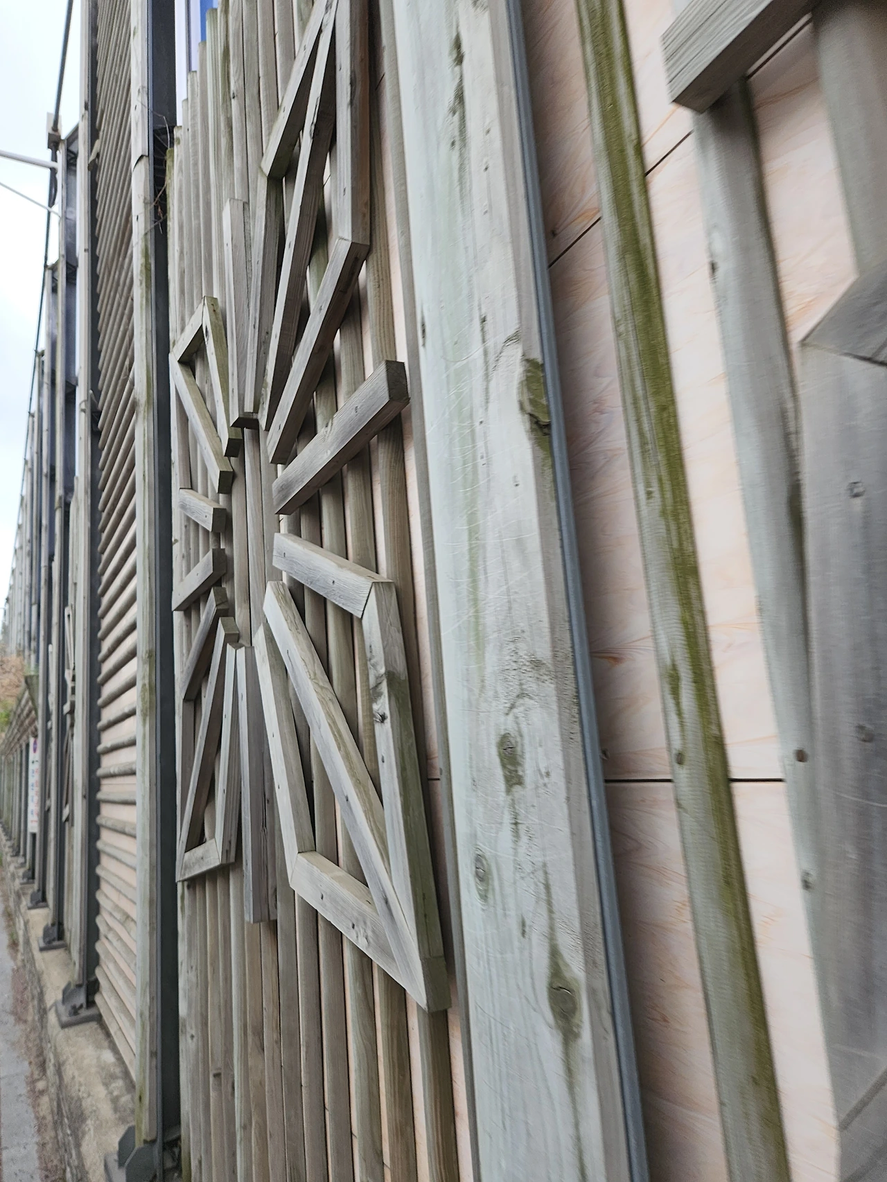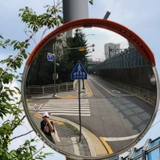 왼쪽: 걷다보면 나오는 후면 반사경, 오른 쪽 : 기찻길 옆 담장을 타고 올라가는 담쟁이며 능소화 꽃 덩쿨과 강아지풀