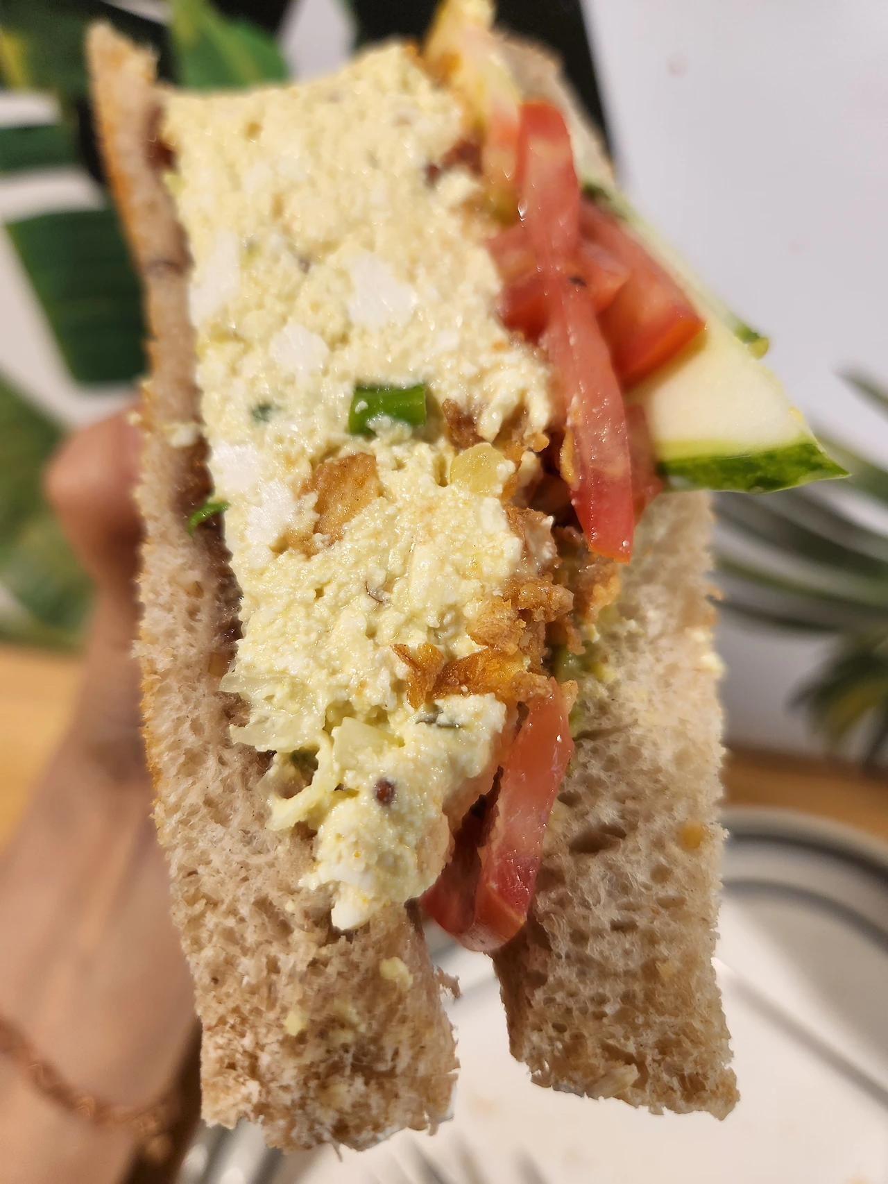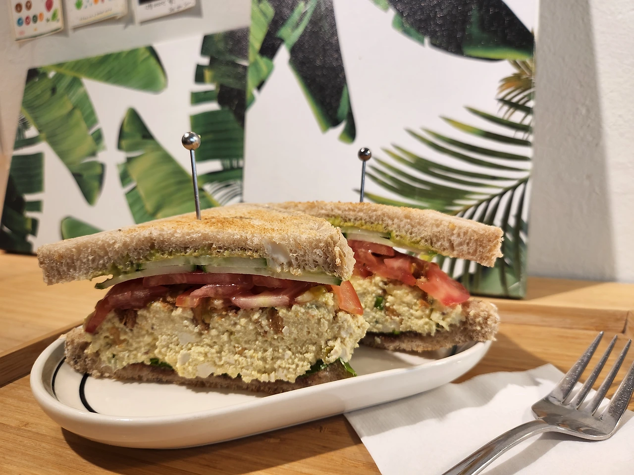 그러니까 두부로 만들어내는 요리 중 세 번째 요리를 먹어야 할 날이었다. 그날의 선택은 '에그리스 샌드위치' 달걀이 들어있지 않은 달걀 샌드위치였다. 첫 방문, 바이 두부 랩도 그랬지만 아니 이 집은 어쩌자고 샌드위치 속을 이리도 꽉 꽉 채워준단 말인지. 나는 그 '뚱뚱하고 충만한 샌드위치'의 자태 앞에서 잠시 할 말을 잊었다. 바삭하게 구워진 비건 빵 사이로 와락 한 잎 깨어 무는데 뭔가 달콤한 맛이 혀에 스민다. 뭐지? 달걀 대신 채워진 두부 맛에 배어진 과하지 않은 스모크향과 슬라이스 된 토마토와 루꼴라 잎도 좋았다. 두부 아니 달걀 아닌 달걀의 그 어마어마한 양은 먹어보지 않으면 알 길 없는 충만한 만족감이다.