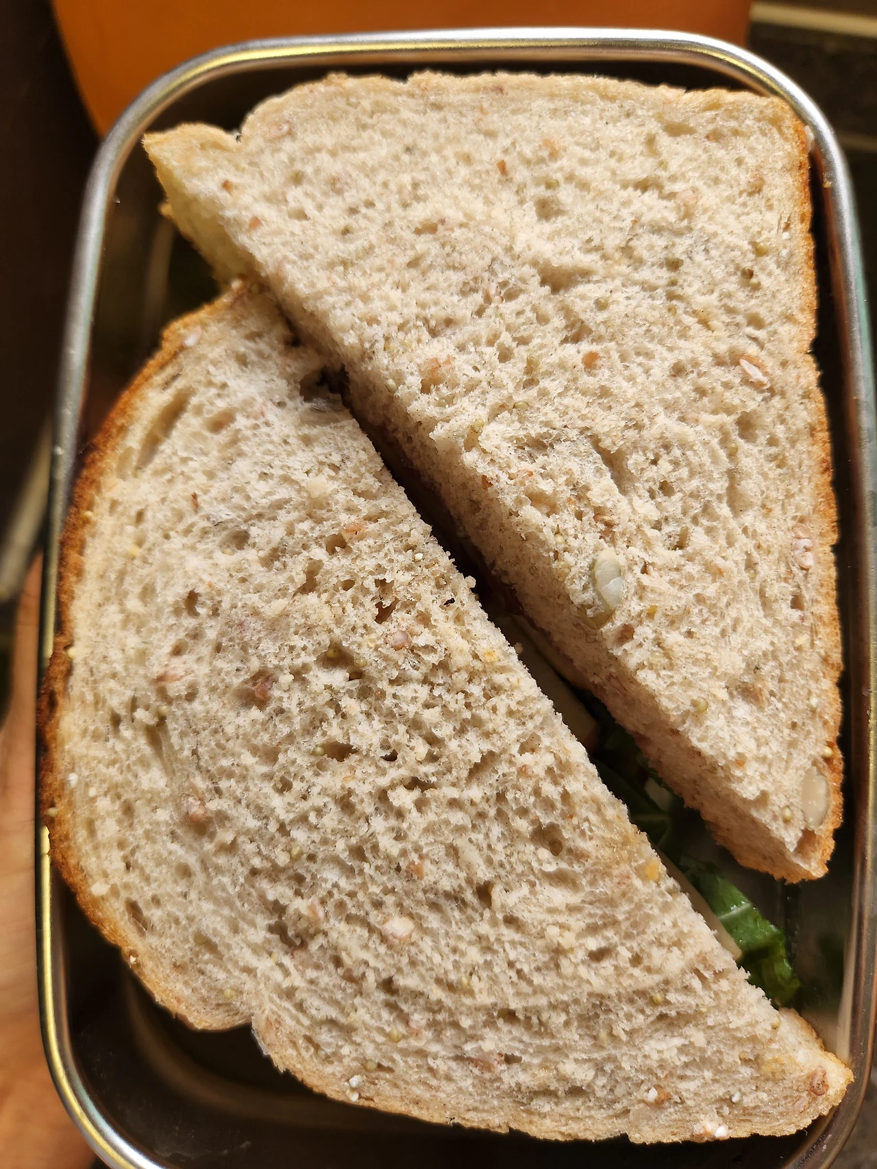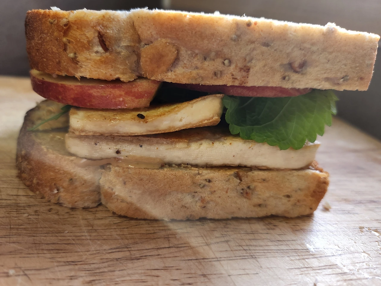 도시락 샌드위치 : 두툼한 빵 사이에 두부와 깻잎, 사과 등 등