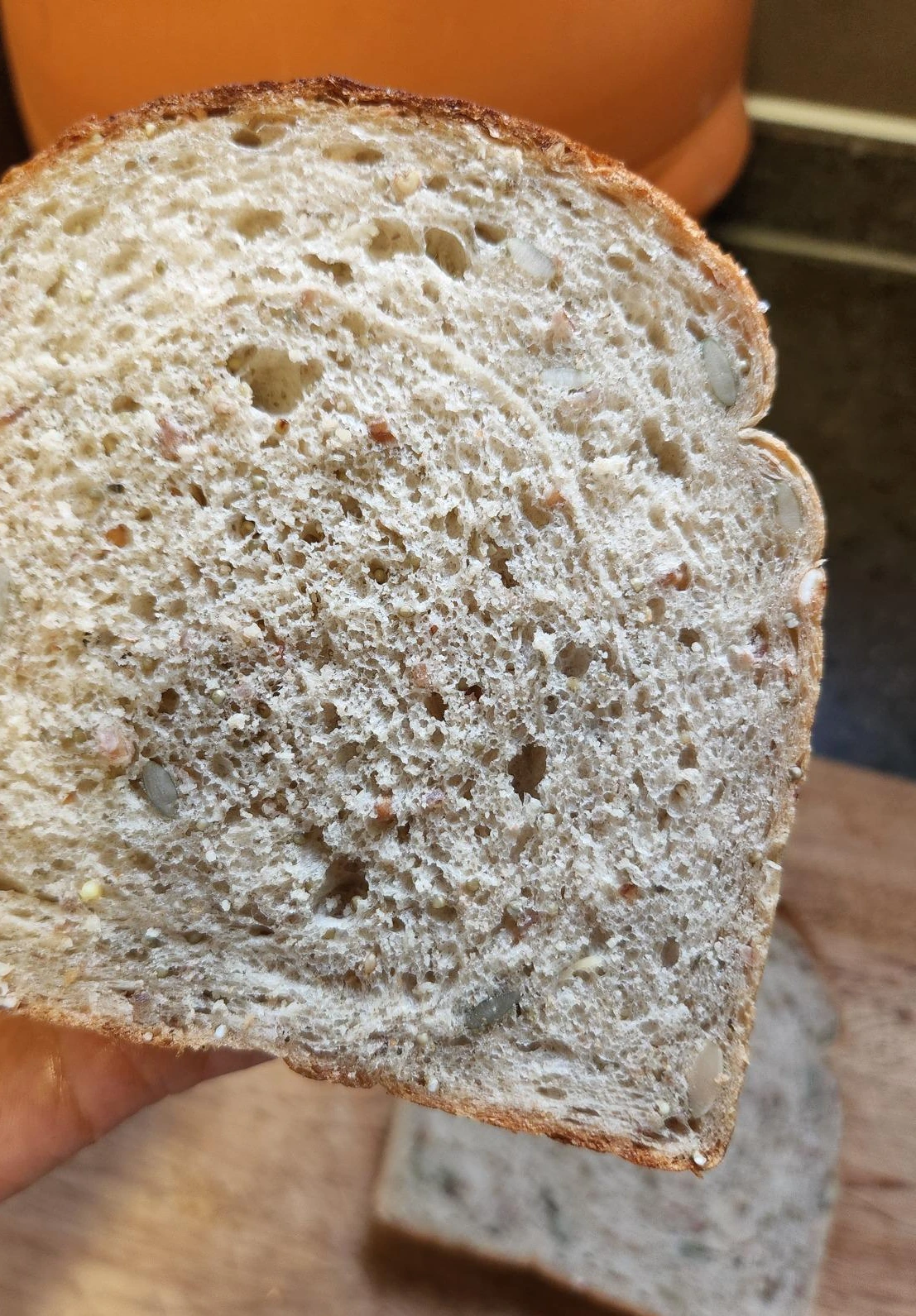 물론 피넛버터나 잼 따위를 바른다거나, 샌드위치 등을 해도 약간의 무게감과 함께 깊은 맛을 내는데 일조를 하지만 말이다. 이 빵은 희고 포근하고 말랑한 글루텐의 결을 슬슬 찢어먹는 식빵이 아니다. 약간 거칠고 단단한 식감과 함께 씹으면 부드러운 목 넘김을 준다. 커피든 두유든, 스푸에 찍어먹든 무엇하고 먹어도 잘 어울린다. 그래서 그런지 이 빵은 두툼하게 자르는 게 얇은 것보다 훨씬 더 맛있다.