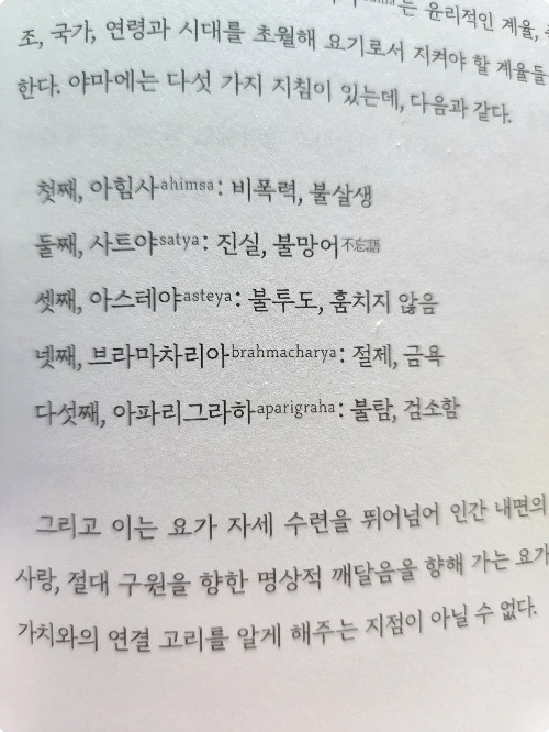 '요가 수련'을 '자세'의 숙련 정도에 목표를 두지 않는 이상 '요가 수련의 진보'를 말하며 '아힘사 라이프'를 별개로 보는 것은 대단한 모순이 아닐까 싶다.