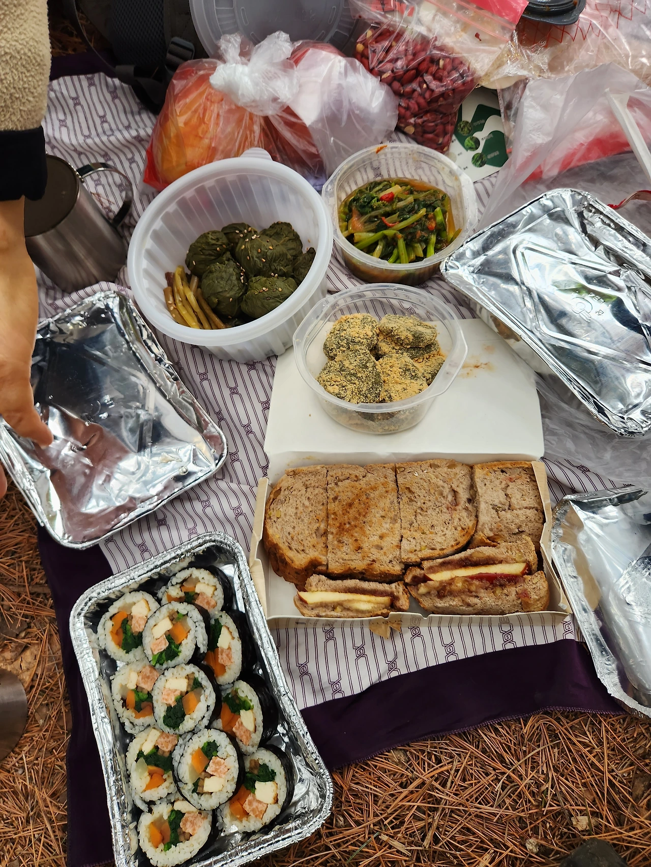 우리는 이 소소한 산행에 합류하러 오신 손님을 잣나무 숲으로 안내했다. 그리고 1차로 각자의 배낭을 풀었다. 어느새 점심시간을 맞이한데다, 짐을 좀 줄이고 걷고 싶기도 했을 것이다. 부지런하고도 솜씨가 섬세한 비건 손님은 머위잎 쌈밥, 쑥떡, 하루나 김치에 땅콩에 귤차를 가져왔고, 또 한 비건은 비건햄과 시금치와 두부를 구워 듬뿍 속을 넣은 김밥을 가져왔다. 그중에서 내가 가져간 게 제일 빈약한 편인데, 통밀빵에 잼을 바르고 사과와 바나나를 넣고 시나몬을 솔솔 뿌린 과일 샌드위치와 보이차를 가져갔다.
