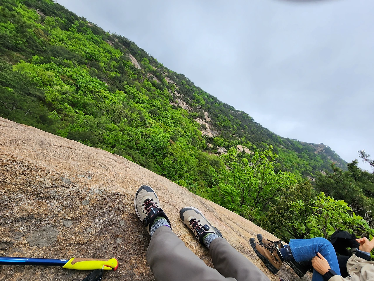 그렇게 1차로 소풍 만찬을 즐기고, 2차로 바윗길을 넘어 평소보다 다소 높은 쪽으로 올라갔다. 등받이 의자처럼 등을 받쳐주는 큰 바위 아래 우리 셋은 기대어 앉았다. 눈앞에는 금세라도 다가올 듯 펼쳐진 초록의 산등성이가 보였다.