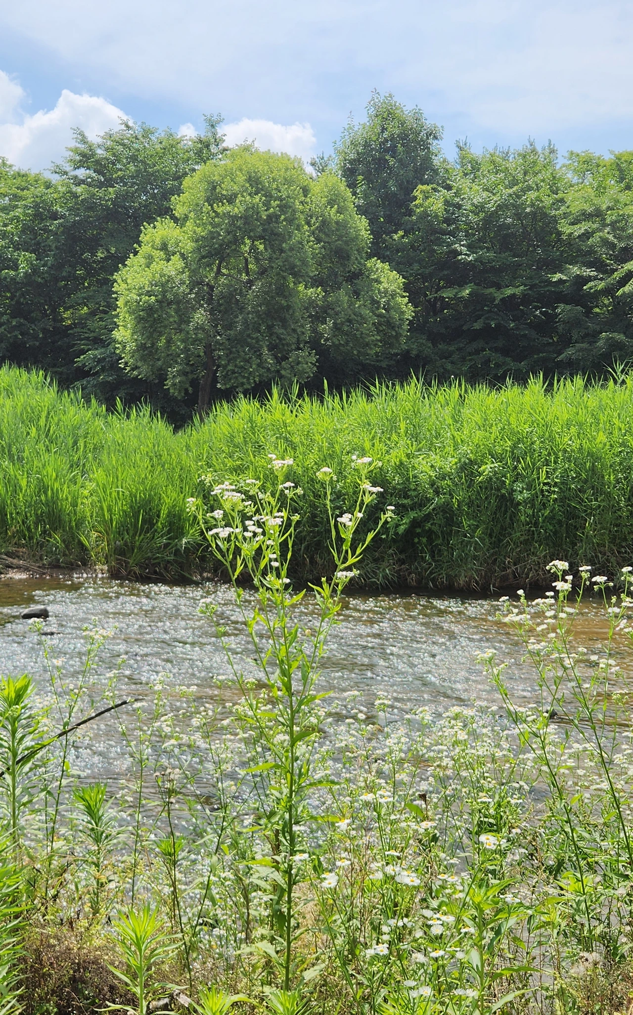여름이 시작될 무렵 천변에 가득 들어차 오르는 생명력, 아름답지 아니한가? 이름 모를 보랏빛 들꽃이며 풀꽃, 꽃창포도 토끼풀도 애기똥풀도, 뫼꽃도 다 그렇게 어여쁘지 아니한가. 정확히 꾀꼬리의 소리를 구분하지는 못하겠지만 꾀꼬리 같은 고운 소리로 노래하는 새들이 천변 나무 위에 둥지를 틀고 살고 있다. 너구리도 산다. 하천에는 청둥오리가족이 살고 물살이들도 살고 있다. 천변에 사는 나비들 또한 거기 그렇게 살만한 까닭이 있어 살고 있을 것이다.