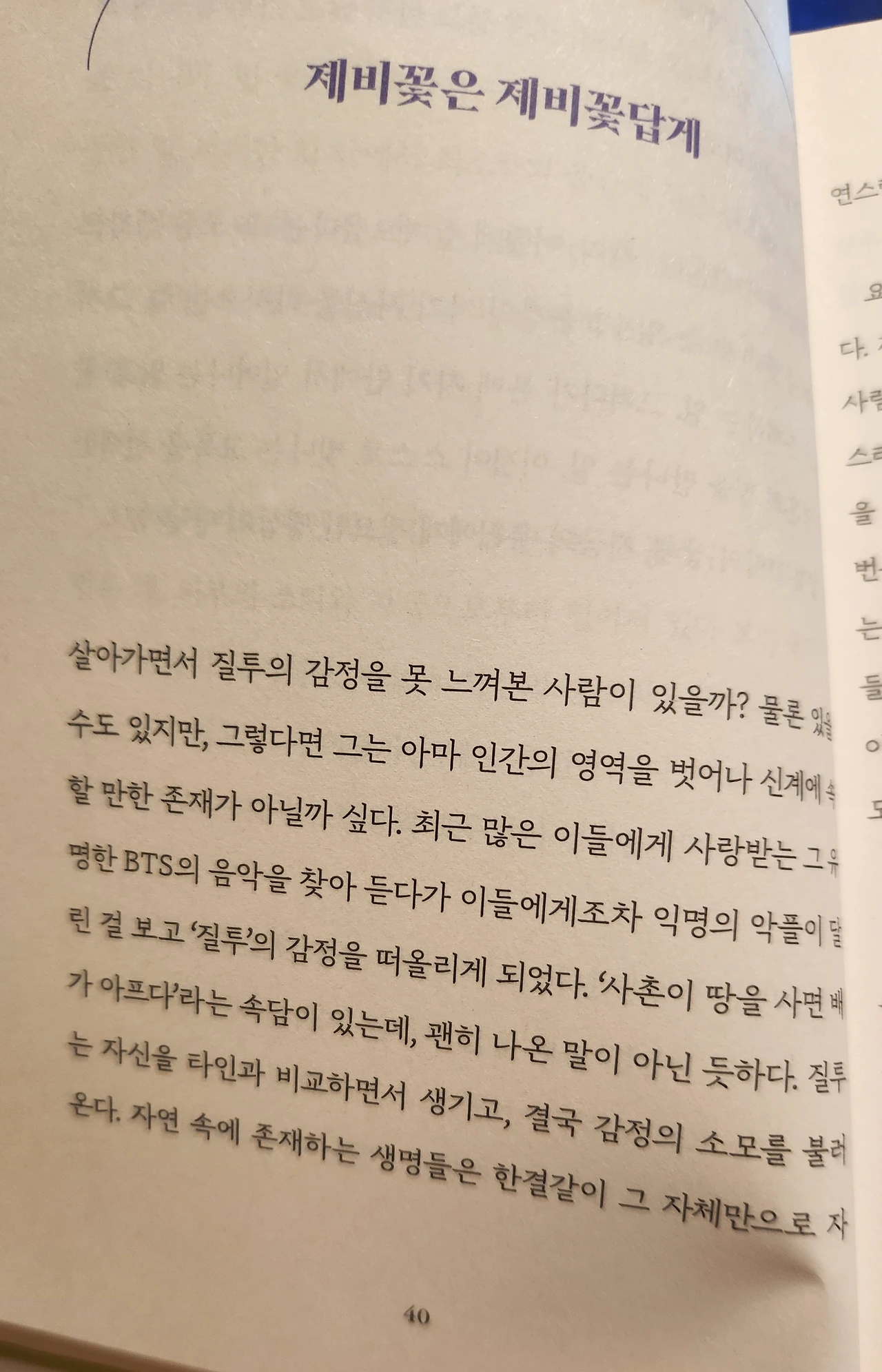 꽃들은 남을 부러워하지 않습니다. 제비꽃은 결코 진달래를 부러워하지 않고, 진달래는 결코 장미를 부러워하지 않습니다. 있는 그대로 자신을 한껏 꽃피우다가 떠날 시간이 되면 아무 말 없이 떠나갑니다. 만일 제비꽃이 진달래를 부러워하고 진달래가 장미를 부러워한다면 꽃들의 세계에서도 인간들과 똑같은 불행한 일들이 일어나고 말 것입니다.