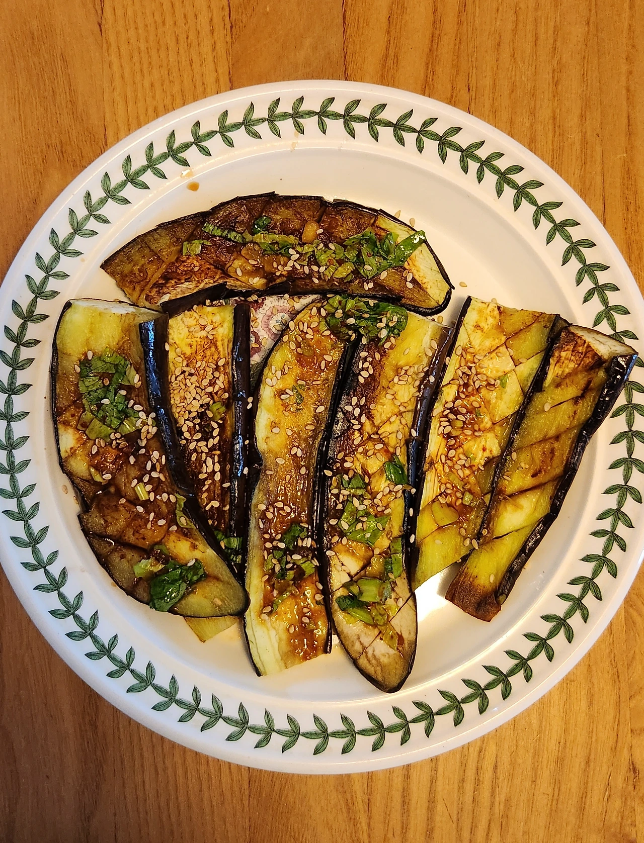 때마침 싱싱한 가지 사 온 게 생각이 났다. 좀 그럴듯하게 가지도 굽고 싶어졌다. 가지에 칼집을 냈는데 어디선가 본 가지 덮밥의 비주얼이 생각났기 때문이다. 어쨌든 가지에 칼집을 냈다. 그대로 살짝 구워도 괜찮았다.
