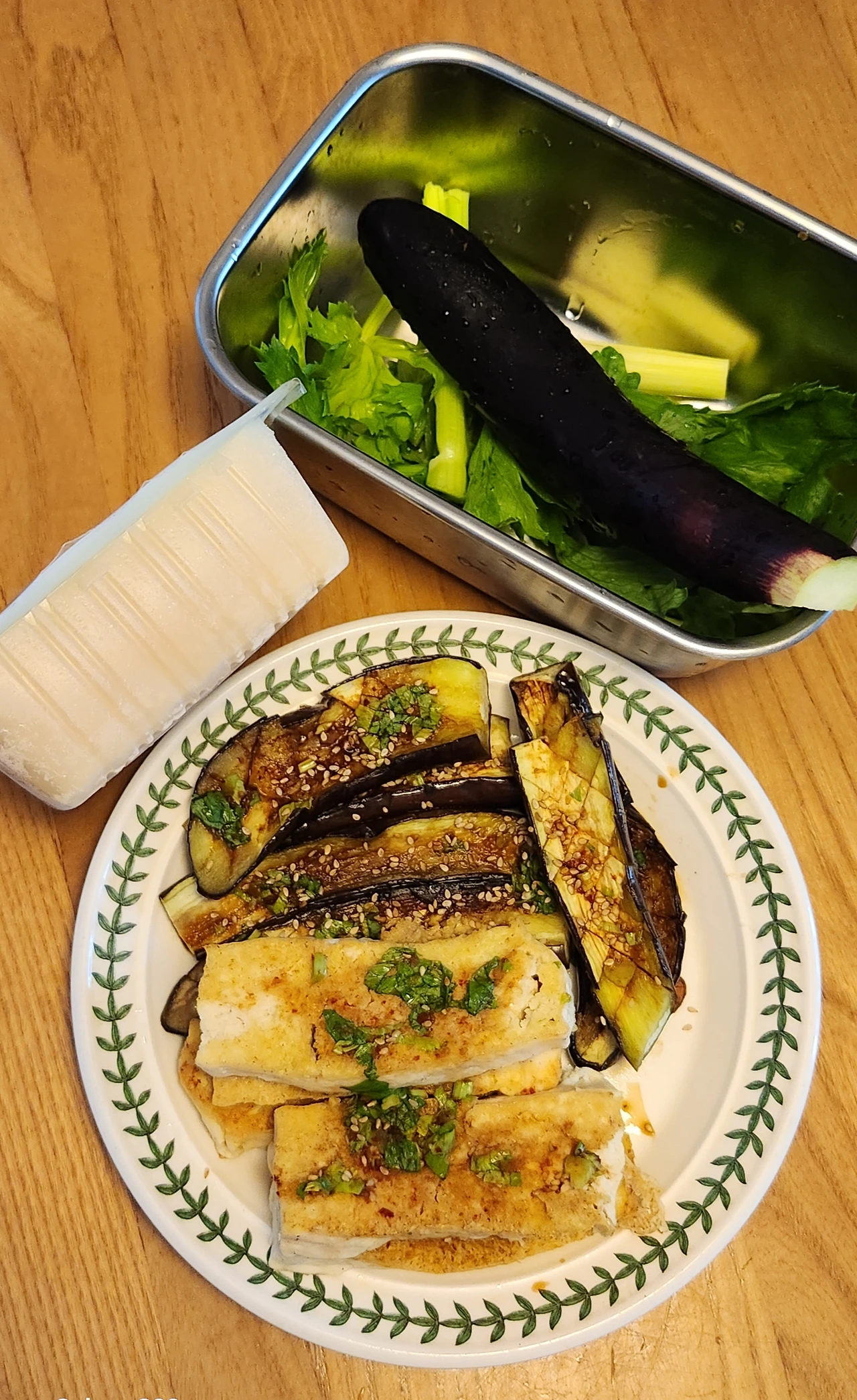 왼쪽 : 칼집 낸 가지에 양념장만 올려도 맛있다. 오른 쪽 : 기름없이 굽는 두부