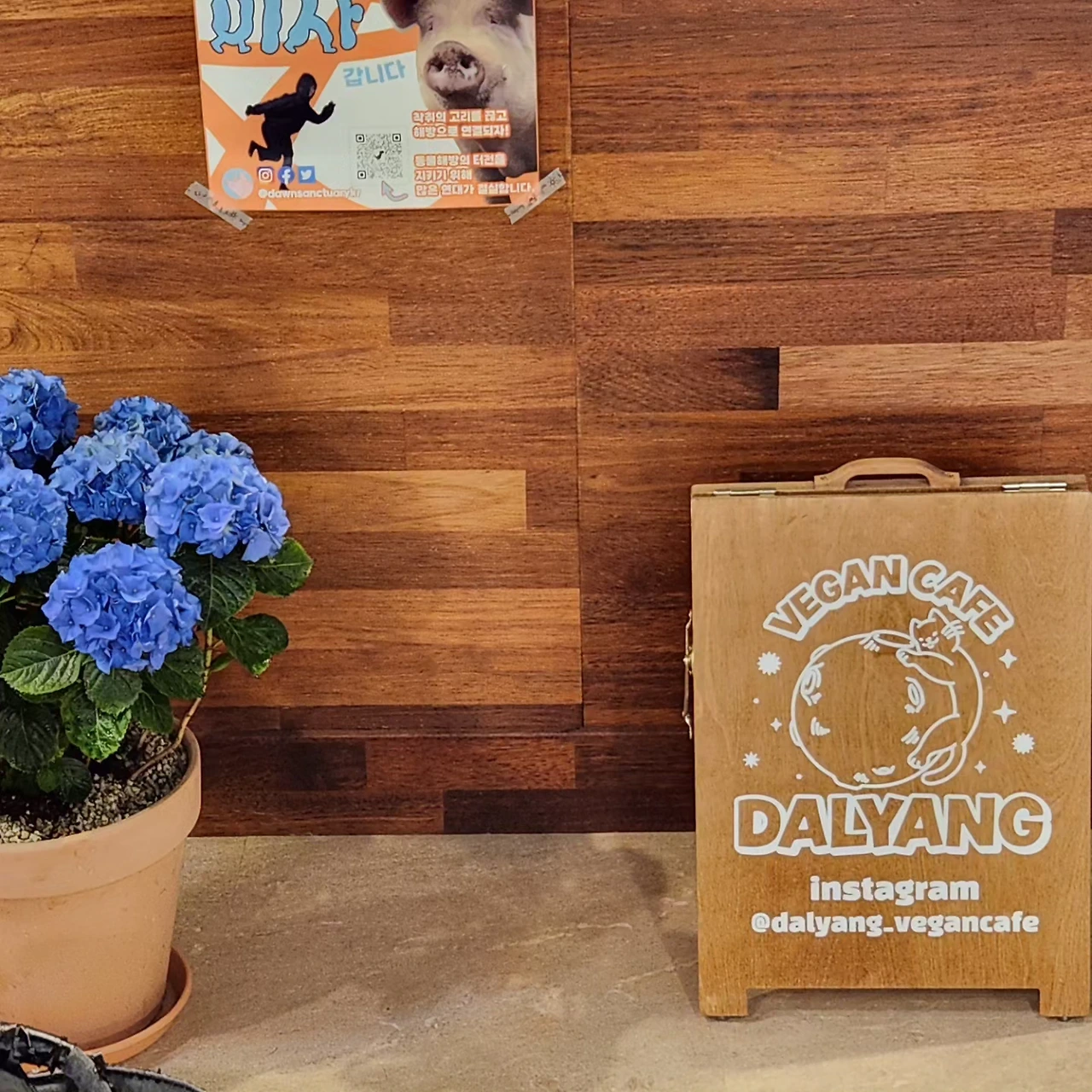본 일정보다는 새로 생긴 비건 카페 달냥에 갈 생각으로 들떠있던 우리 비건 자매 눈에 띈 귀여운 달고양이 그림의 간판이 반가웠던 기억이 선명하다. 아날로그 감성 묻어나는 아기자기한 인테리어 사이'동물권 행진'이나 '비거니즘' '비건'과 '생명' 관련 아티스틱한 포스터들이 촘촘히 붙어있었다.