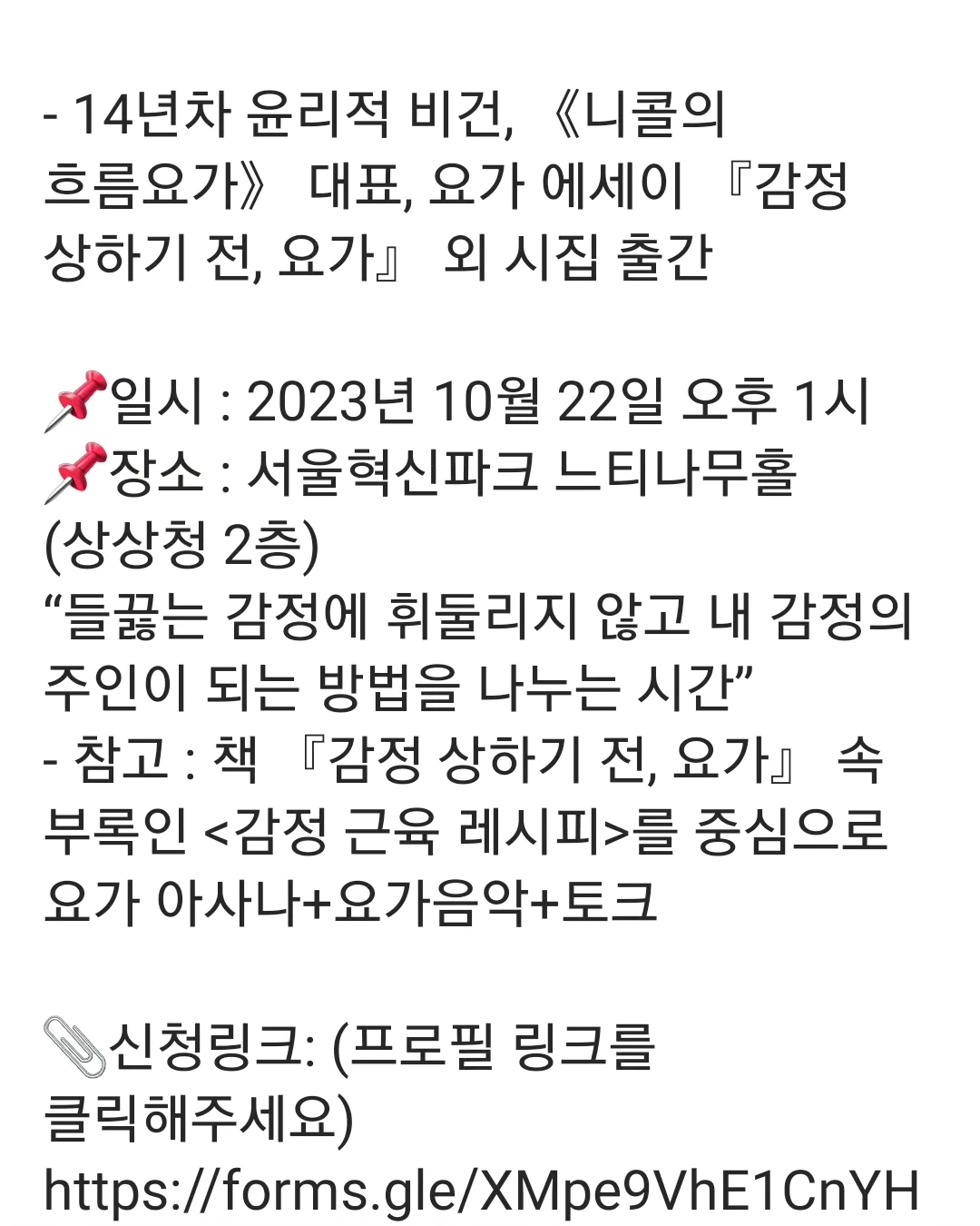 10월 22일 오후 1시 느티나무 홀 비건 요가 워크숍 / 감정 상하기 전 요가