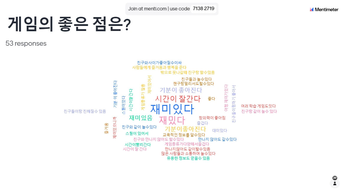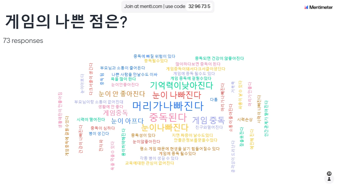 두 번째로 ‘게임은 좋은 걸까요? 나쁜 걸까요?’라는 질문이다. 물론 게임이 좋기도 하고 나쁘기도 하다는 걸 대부분의 아이들이 잘 알고 있다. 재미있는 건 게임의 좋은 점에 대해 이야기하는 아이들보다 나쁜 점에 대해 이야기하는 아이들이 훨씬 많다는 것이다. 매체를 통해, 혹은 주변의 어른들을 통해 게임의 좋은 점보다 나쁜 점에 대해 훨씬 많이 접했기 때문이라고 생각한다.