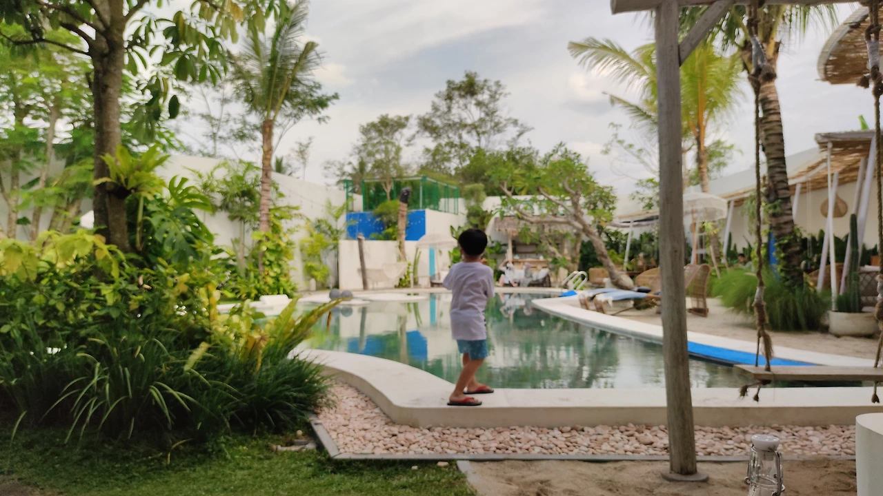 예약을 따로 하지 않고 갔는데 옷을 깔끔하게 차려입은 종업원이 문 앞에서 안내를 한다. 예약을 안 했고 가족이 네 명이고 그중 둘은 아이라고 말하니 의미심장하게 우리 레스토랑은 최소 주문금액이 있는데 성인은 한화로 7,000원, 아이들은 4,000원 정도라고 이야기한다. 알겠다고 하니 자리로 안내한다. 그네와 모래밭이 있는 수영장 쪽 자리로 안내를 받아서 최소 주문금액을 신경 쓰면서 메뉴판을 봤다. 대략 한화로 계산할 때, 콜라 한잔에 1,200원, 1리터 생수 1,500원, 아이스 아메리카노2,000원 등등의 가격이 매겨져 있었다. 식사도 피자 한판에 8,000원, 김치 퀘사디아 7,000원 하는 식이다. 인테리어도 음식의 맛도 괜찮은 호텔 수준인 걸 생각해보면 미안한 가격이다. 아이들이 그네 타는 걸 좋아해서 점심 먹고 커피를 마시고, 아이스크림까지 먹고 네 시간 넘게 머물다 왔다.