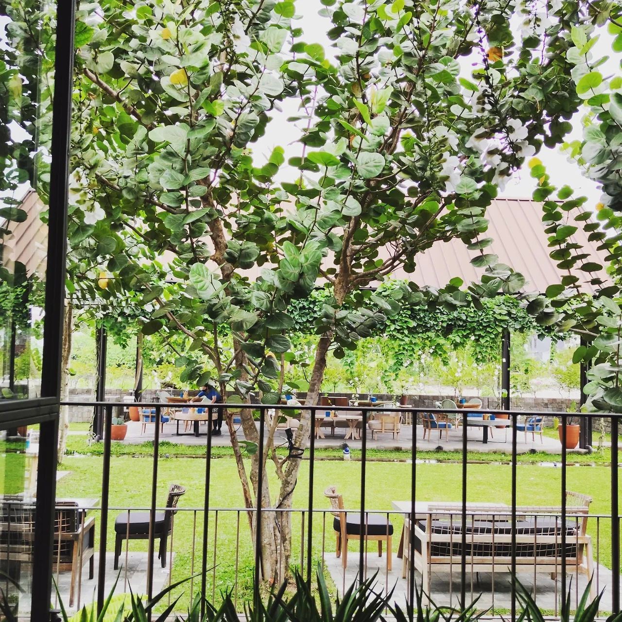 버스도 안 다니는 인도네시아 시골에 살면서 감사하고도 신기한 건 곳곳에 분위기 좋은 카페들이 있다는 거다. 아이들을 데리고 태권도장에 갈 때마다 보던 Triology란 카페도좋아 보였는데, 한 번 가려고 벼르고 있다가 오늘 드디어 가 보게 됐다. 넓은 주차장과 시원한 바, 여유로운 좌석과 멋진 정원까지 오길 잘했다는 생각이 들었다. 특히 통풍이 인상적이었는데 에어컨을 달지 않았는데도 자연바람과 선풍기만으로도 쾌적한 온도를 만들어 내고 있었다. 실내에 앉았지만 야외에 앉아 있는 기분이었다. 앞뒷면 전체를 접이식 창으로 해놨기에 가능한 일이다.