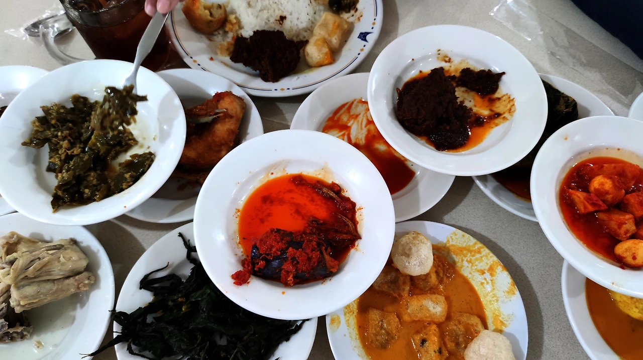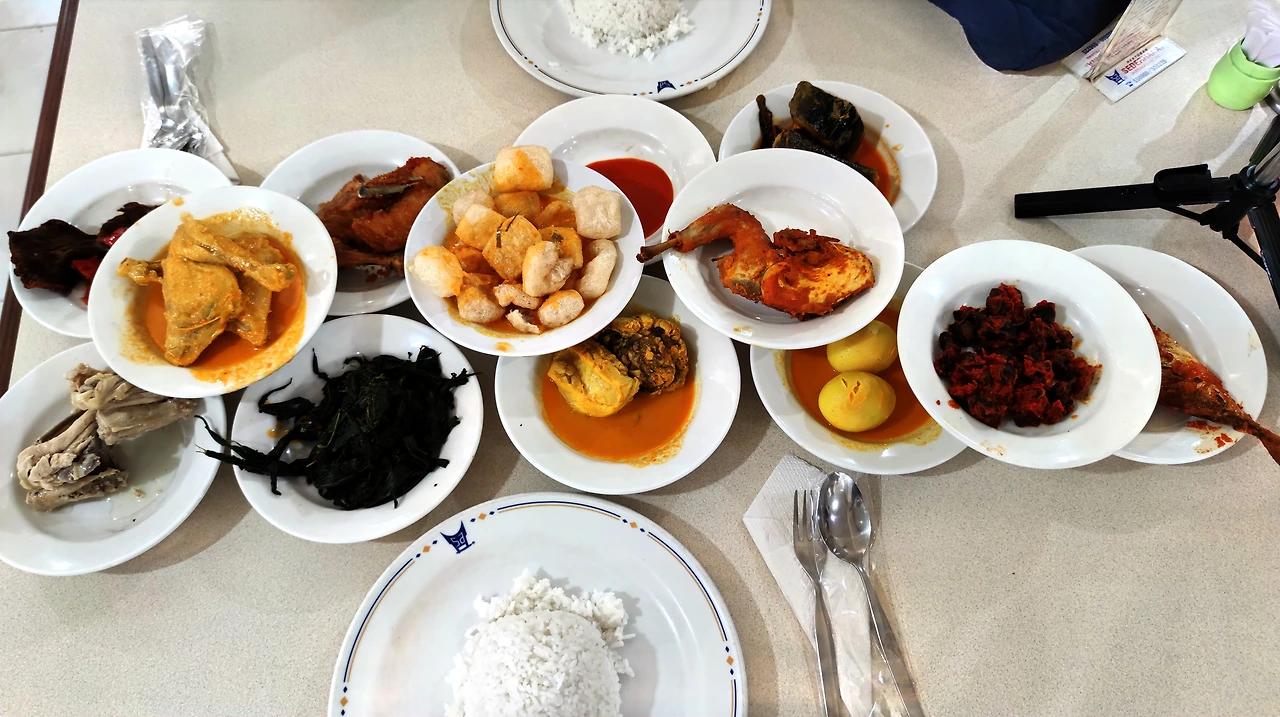 편한 자리에 앉으라는 종업원의 말을 듣고 구석 자리에 앉아서 10분 정도 기다리니 주문도 받지 않고 일단 요리를 내 오기 시작한다. 빠당음식점에서 식사를 해 보지 않은 거지 도시락 형태로는 먹어보고 포장도 해 본 경험이 있기 때문에 빠당음식을 먹는 스타일을 전혀 몰랐던 것은 아니다. 그러나 역시 식당에서 먹어본 것이 처음이다 보니 촌사람이 서울에 처음 올라왔을 때 어리바리한 것처럼 왠지 모를 어색함을 느낄 수밖에 없었다. 빠당요리는 일단 종업원이 음식을 테이블에 세팅해 놓으면, 그중 먹고 싶은 것만 골라먹고 계산을 하는 방식이다. 우리 가족이 잘 먹는 인도네시아 요리는 나시고렝(볶음밥), 미고렝(볶음면), 나시 아얌 바까르(구운 닭과 소스, 그리고 밥), 사테(꼬치요리), 소또(국물요리), 이가 바까르(갈비구이) 등인데 이러한 음식은 어느 특정지역의 음식이라고 하기에는 애매한 측면이 있다. 나시 고렝의 경우, 인도네시아 음식이냐 말레이시아 음식이냐 가지고도 서로 다투는 형국이다 보니 지역색이 옅은 것도 사실이다. 그러나 한국 음식 중에서는 쇠고기 장조림과 흡사한 른당의 경우, 말레이 문화권 곳곳에서 먹는 음식이기도 하지만 빠당요리로 분류되는 것에 대한 특별한 논란이 없는, 비교적 지역색이 분명한 음식이라고 할 수 있다.