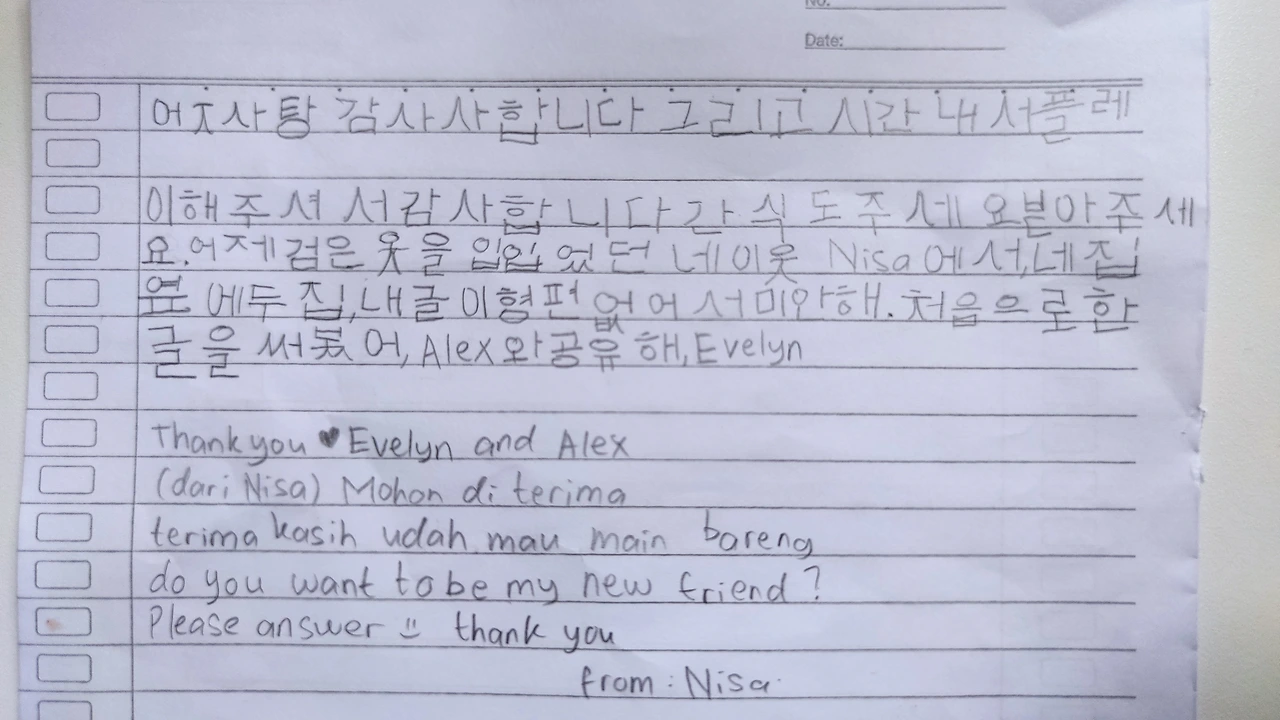 말도 안 통할 텐데 어떻게 하나 하고 유심히 살펴보니 구글 번역기를 사용해서 서로 이야기를 한다. 예전에 아이들이 나오는 유튜브 채널에서 봤던 게 생각났다. 역시 아이들은 어른들의 상상력을 뛰어넘는다. 영어로 대화하는지 인도네시아어로 대화하는지도 물어봤었는데 우리 집 아이는 그냥 이것저것 쓴다고 이야기했다. 어제 나갔다 들어오면서는 새로 사귄 친구가 적어 준 편지라면서 종이를 한 장 들고 왔다. 정말 한글과 영어, 인도네시아어가 다 적혀 있다. 아마도 구글 번역기를 돌려서 같이 놀고 간식을 먹었던 이야기를 써 놓은 것 같다. 그러다 내용 중에 "do you want to be my new firend?"라고 적어 놓은 걸 봤다.