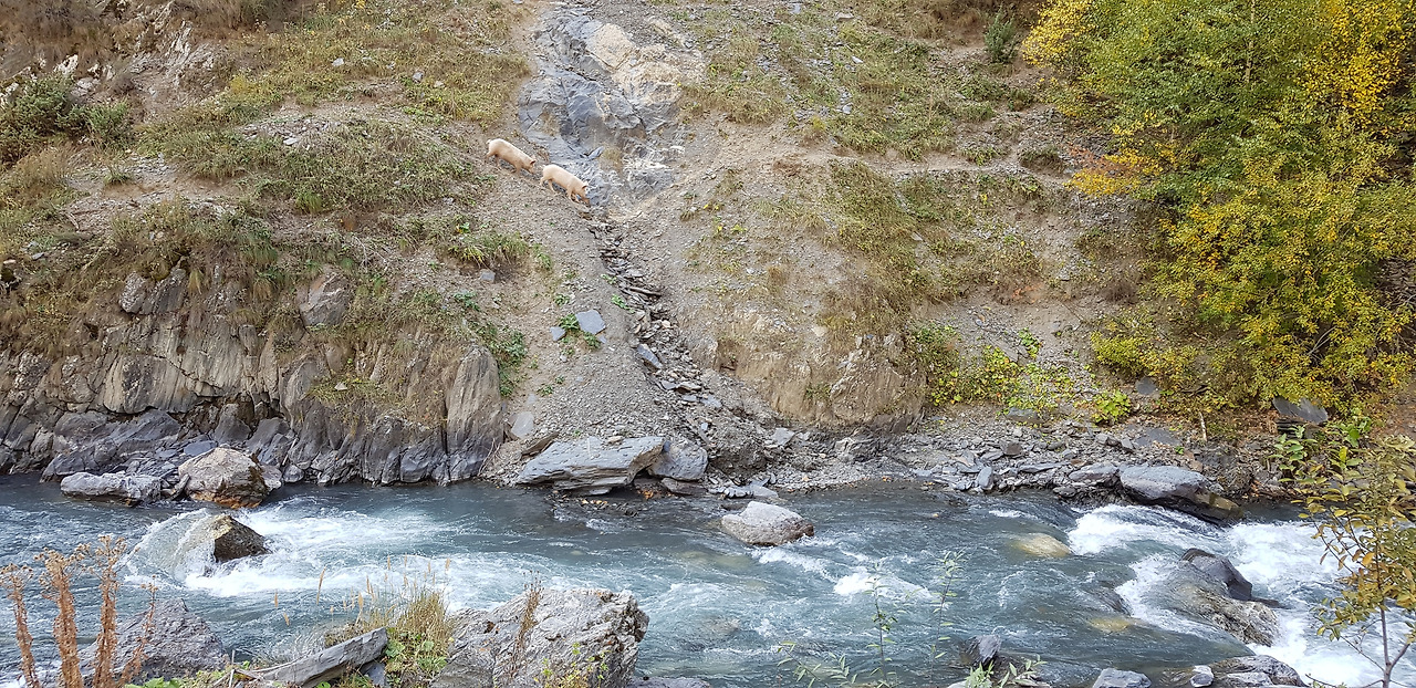 조지아 샤틸리 Shatili 여행 중 만난 집돼지들은 놀랍게도 절벽을 타고 뛰어다녔다.