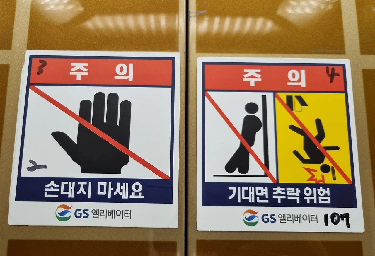 엘리베이터 안에 깔끔하게 정리된 안내 스티커가 붙어 있었다.