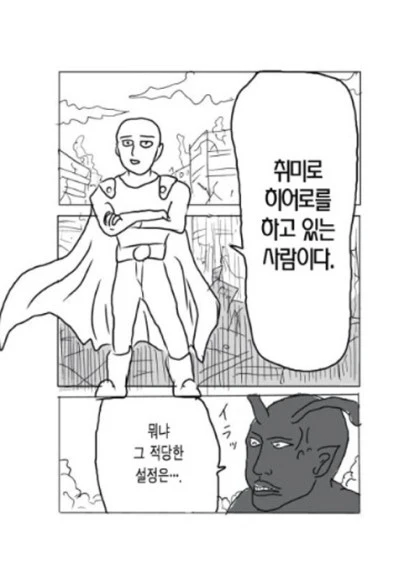 사이타마는 작중 누구보다도 진지하게, 제대로 히어로 활동을 하는 사람이다. 강한 힘을 얻기 위해 수련했고, 악인이 나타나면 달려가 무찔러 사람들을 구한다. 누가 공으로 기록해 주지 않아도, 사람들이 자신의 존재를 몰라도 한다. 하지만 스스로 그 행위를 '취미'라 부르는 이유는, 돈을 대가로 받지 않기 때문일 것이다.