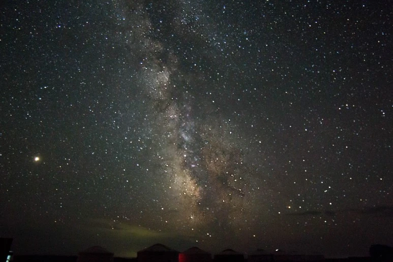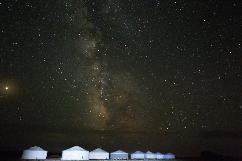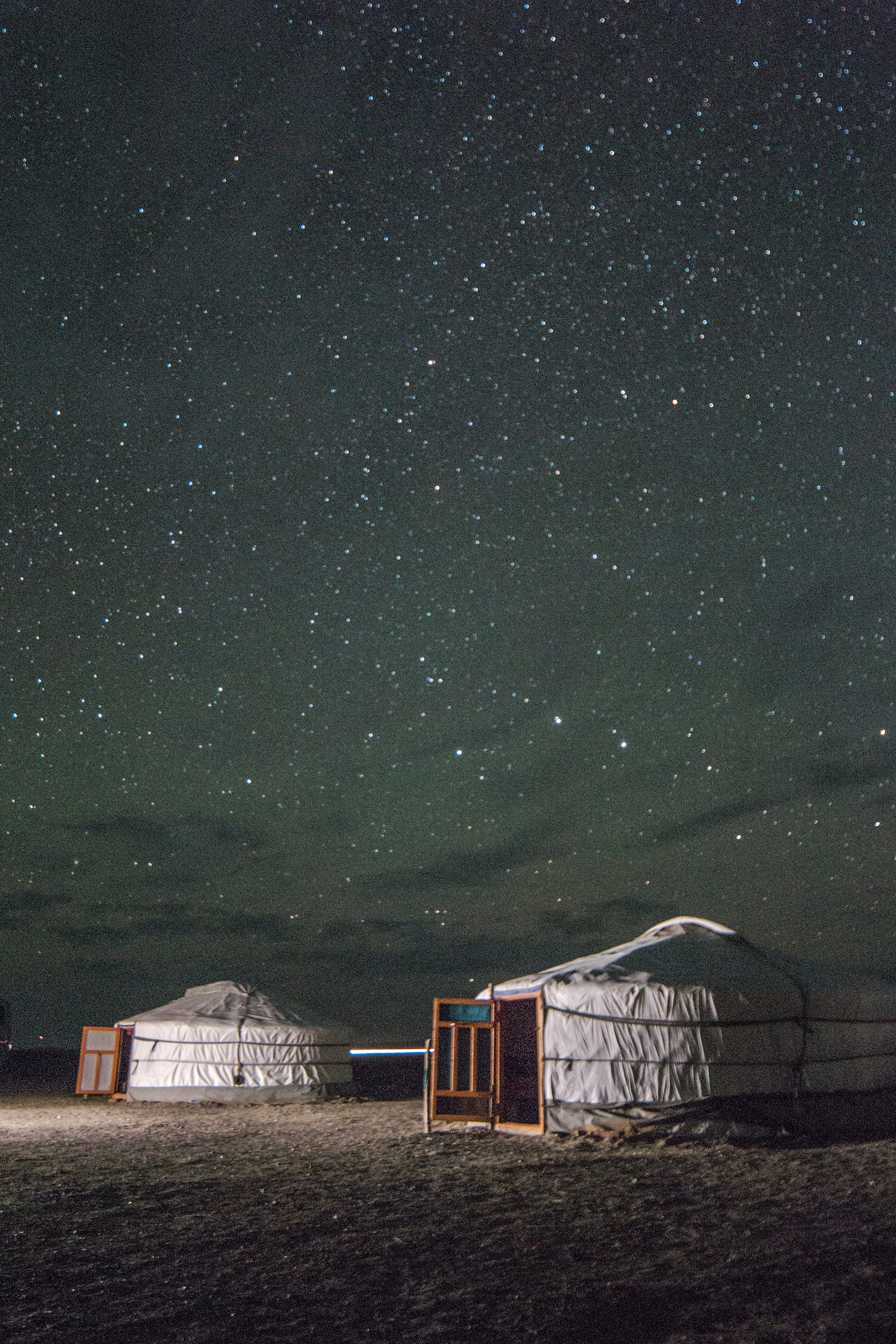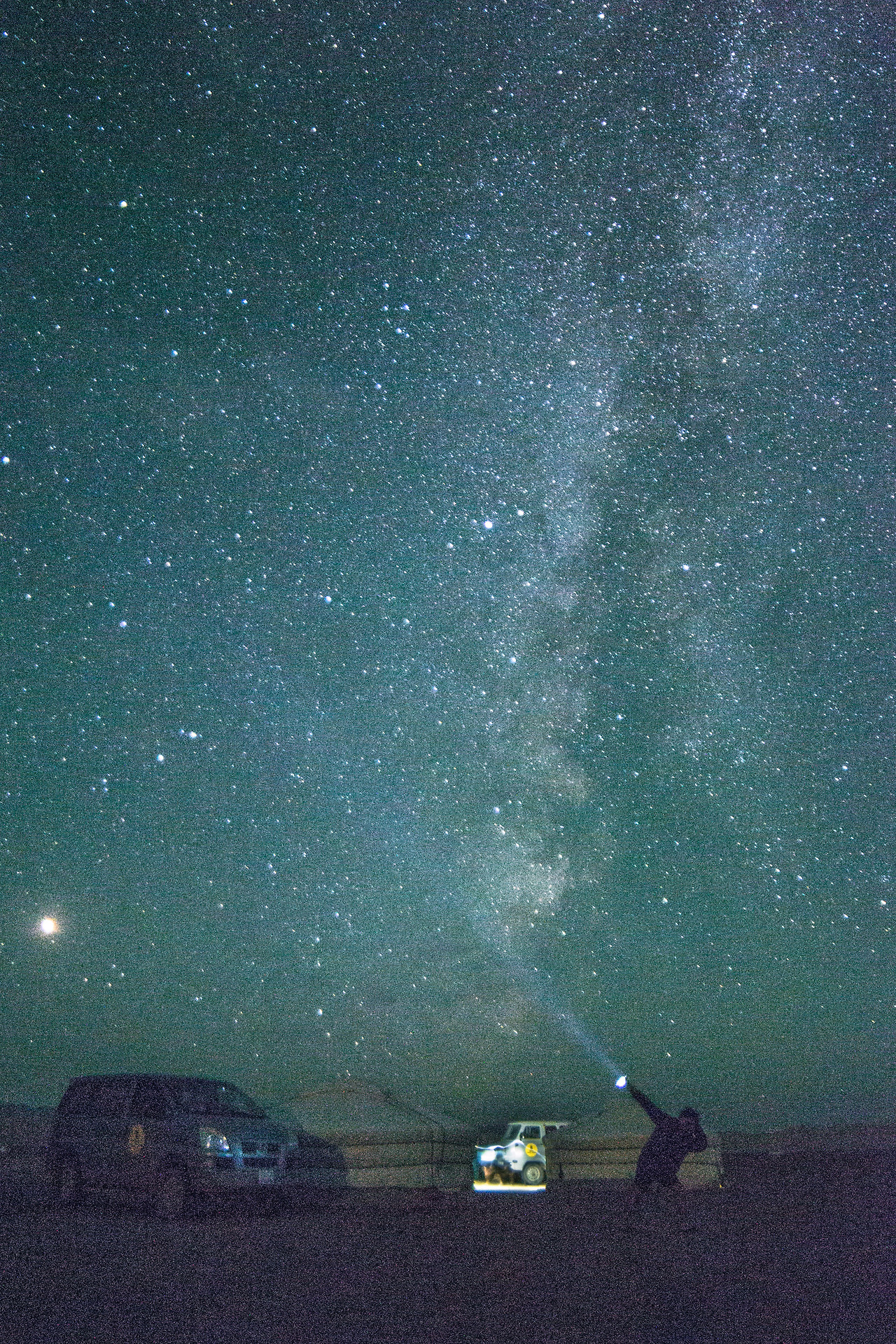 밤 열 시 반쯤 되었을까, 갑자기 사진작가 팀의 가이드가 들어와 별을 봐야 한다고 우리를 재촉했다. 달이 뜨면 별이 보이지 않을 테니 얼른 봐야 한다며, 오늘처럼 별이 보일 일은 별로 없다고 했다. 급히 장비를 챙겨 게르 밖으로 나왔다. 게르 문밖으로 나오자마자 시선은 자동으로 하늘에 고정됐다. 고개를 든 채 하늘을 보며 걷다가 넘어질 뻔했다.