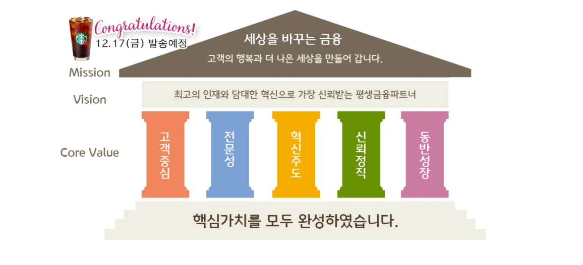 황금카드 1개당 기업 핵심가치 한 개를 완성할 수 있다. 핵심가치를 전부 완성하면 스타벅스 아메리카노 기프티콘을 받을 수 있다. 소소한 재미를 느낄 수 있었고, 기업 핵심가치를 다시 한 번 되새길 수 있는 기회가 되었다. 동시에 KB국민은행 게더타운 구경도 할 수 있는 것이 좋았다!