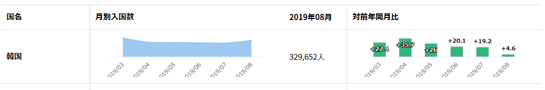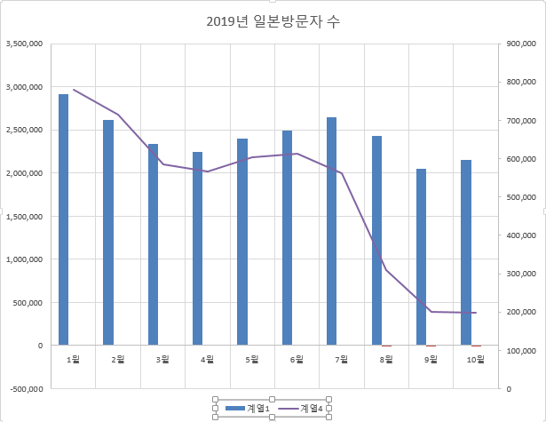 이 표를 보면, 금년 7월부터, 한국사람의 일본방문을 반 이상 줄었다. 막대그래프는 출국자수(왼쪽데이터)를 나타낸다. 그에 대해, 실선그래프는 일본으로 출국하는 사람들의 수(오른쪽데이터)이다.